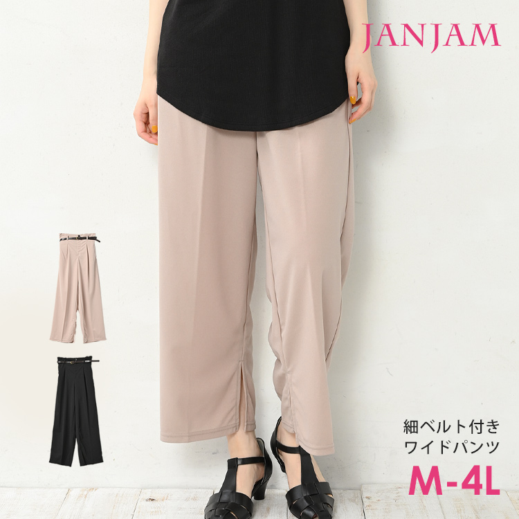 ワイドパンツ 大きいサイズ レディース メール便送料350円 ベルト付き ロング丈 バックウエストゴム サイドスリット ボトムス M LL 3L 4L