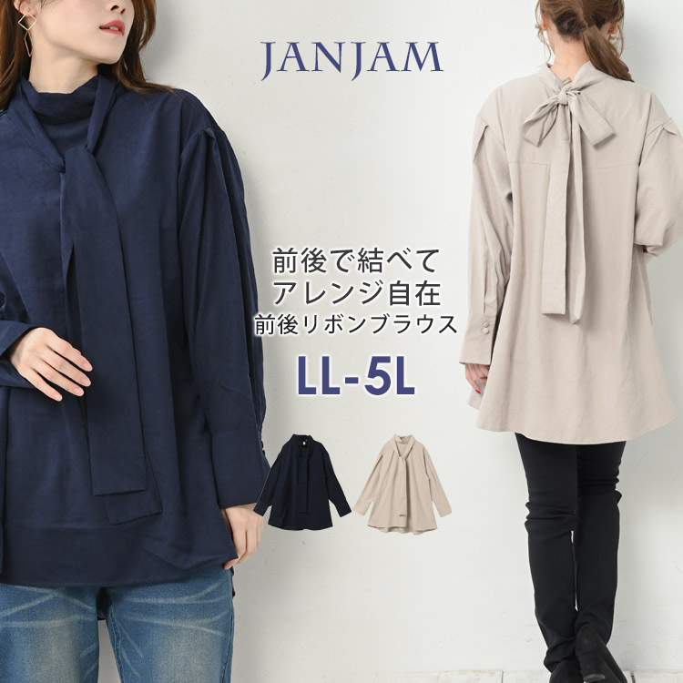 リボンタイブラウス 大きいサイズ レディース メール便送料無料 長袖 ボウタイ バックテール トップス LL 3L 4L 5L