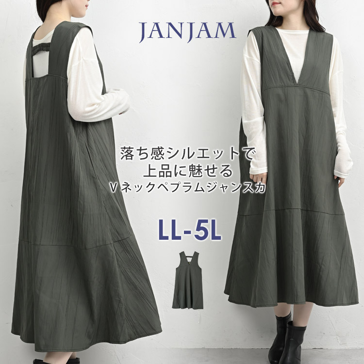 ペプラムジャンパースカート 大きいサイズ レディース ロング丈 Vネック ノースリーブ ジャンスカ LL 3L 4L 5L