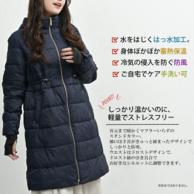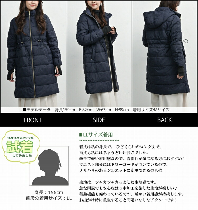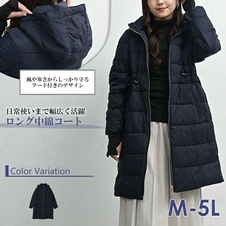 ロング中綿コート 大きいサイズ レディース 長袖 ジップアップ ドローコード 撥水 防風 防寒 アウター M LL 3L 4L 5L