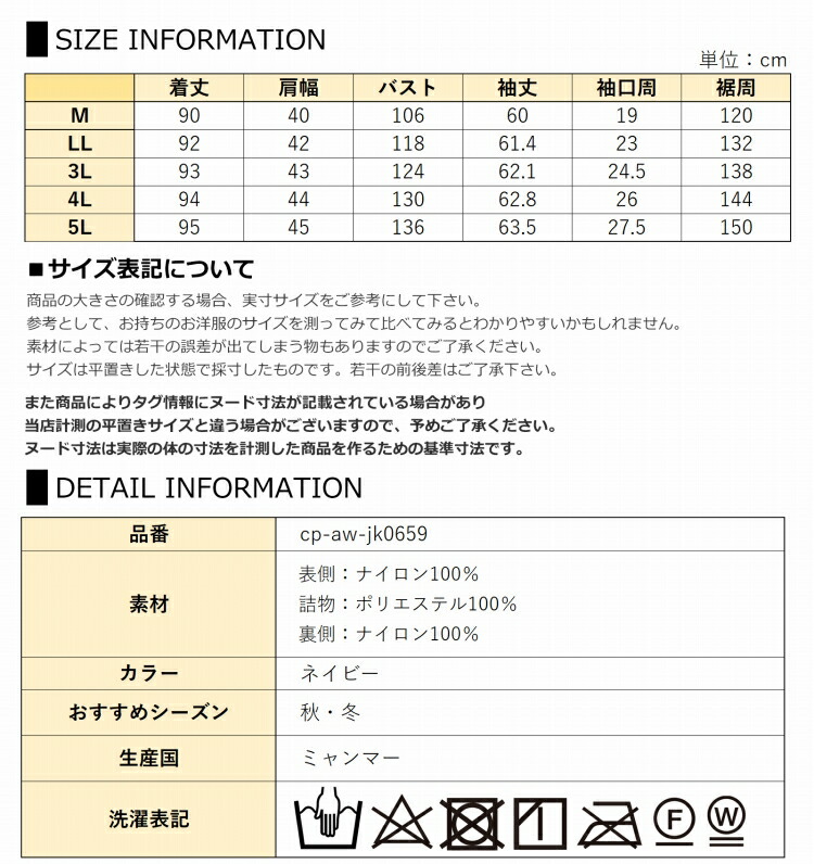5L:着丈95 肩幅45 バスト136 袖丈63.5 袖口周27.5 裾周150