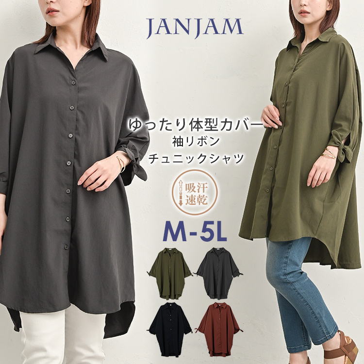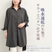 シャツチュニック 大きいサイズ レディース メール便送料350円 7分袖 袖口リボン 前開きボタン 吸汗速乾 トップス M LL 3L 4L 5L