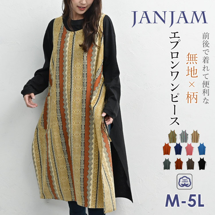 エプロンワンピース 大きいサイズ レディース メール便送料350円 ミドル丈 無地×総柄 エプロンドレス cotton100 M-5L