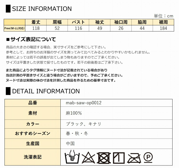 F【M-LL対応】:着丈118 肩幅52 バスト116 袖丈49 袖口周26 脇周44 裾周184