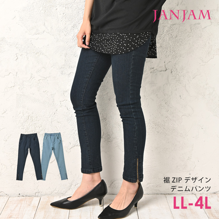 スキニーデニム 大きいサイズ レディース スリムパンツ 裾ジッパー 10分丈 ウエストゴム ボトムス LL 3L 4L