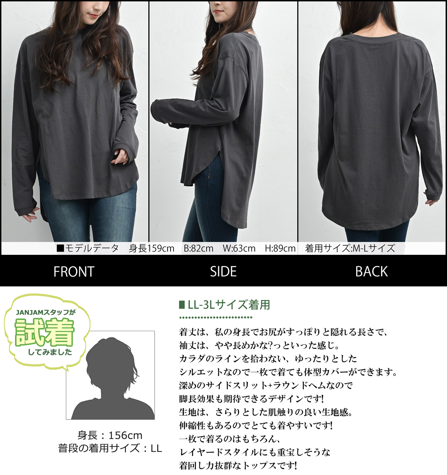 LL-3L:着丈70-78 肩幅60 バスト126 袖丈54 脇周52 袖口周20-26 裾周126