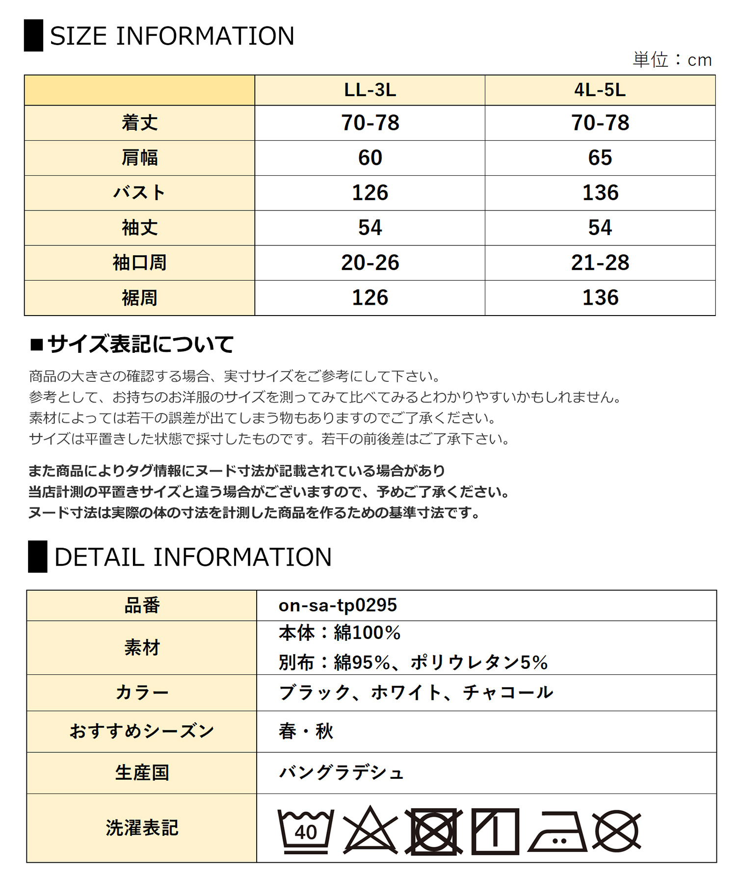 4L-5L:着丈70-78 肩幅65 バスト136 袖丈54 脇周54 袖口周21-28 裾周136