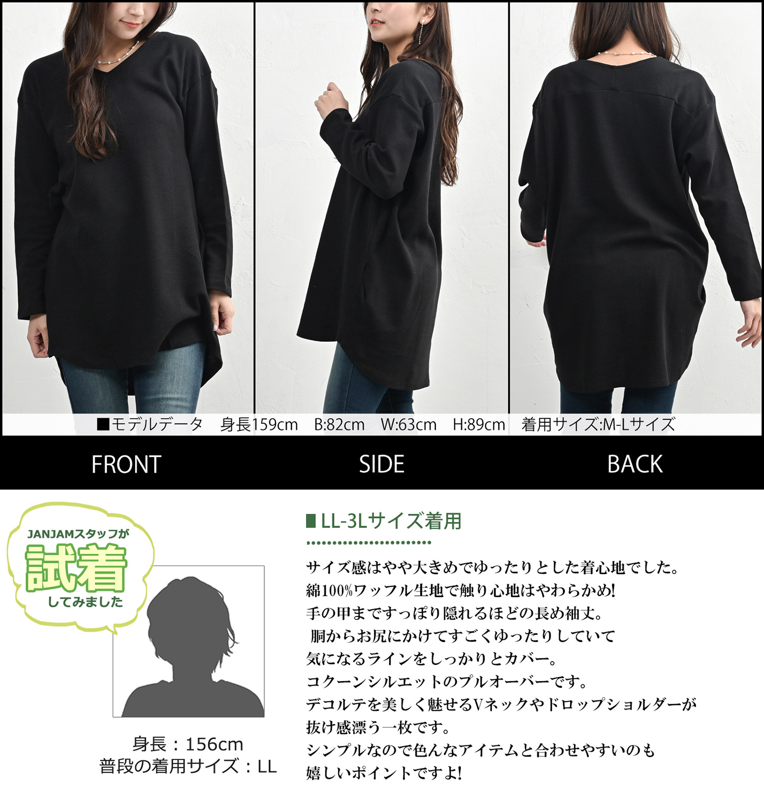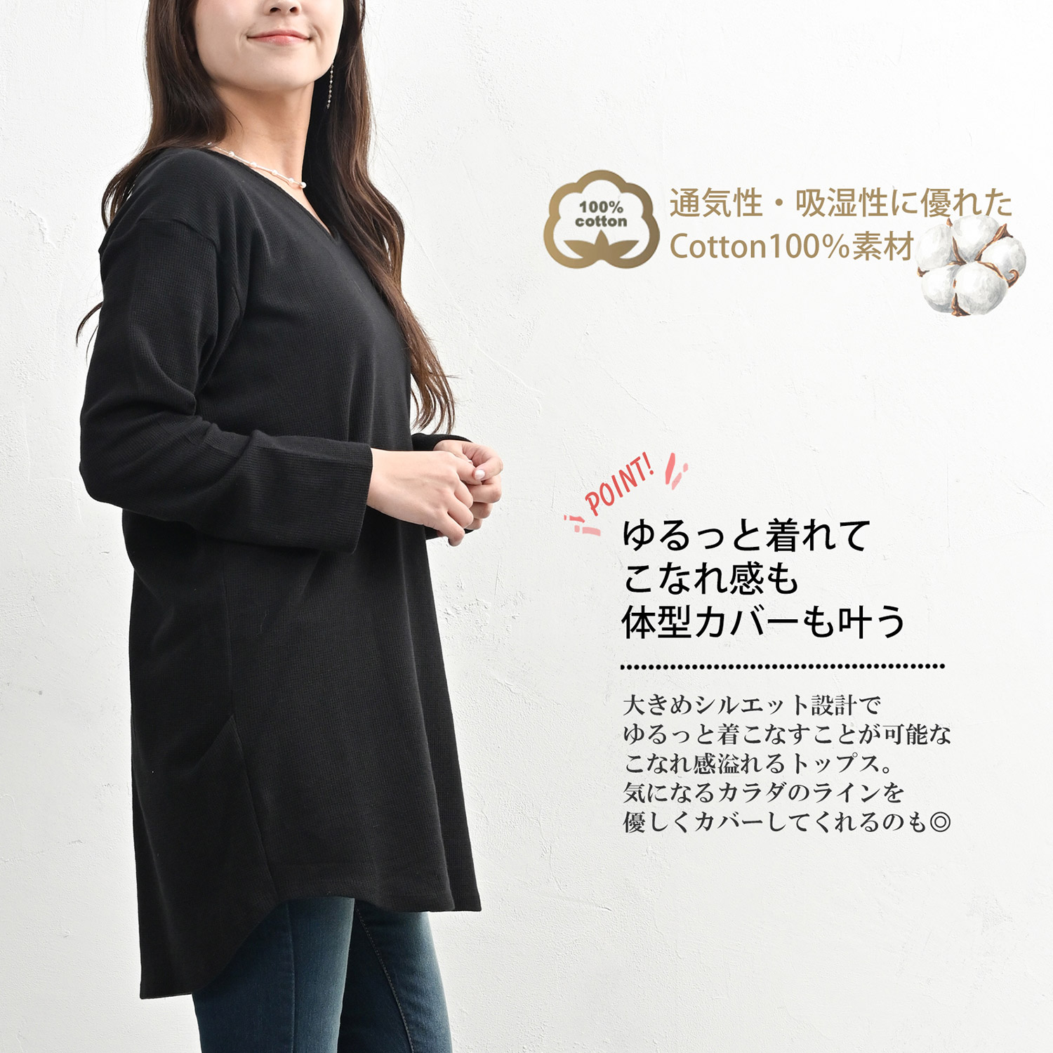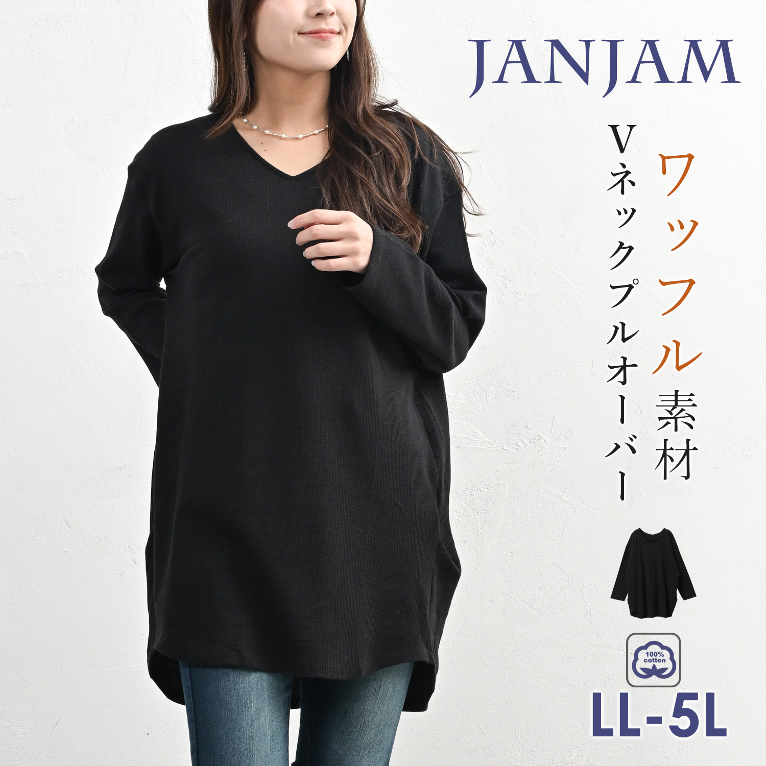 コクーンプルオーバー 大きいサイズ レディース 長袖 Vネック ワッフル生地 cotton100 トップス LL-3L 4L-5L