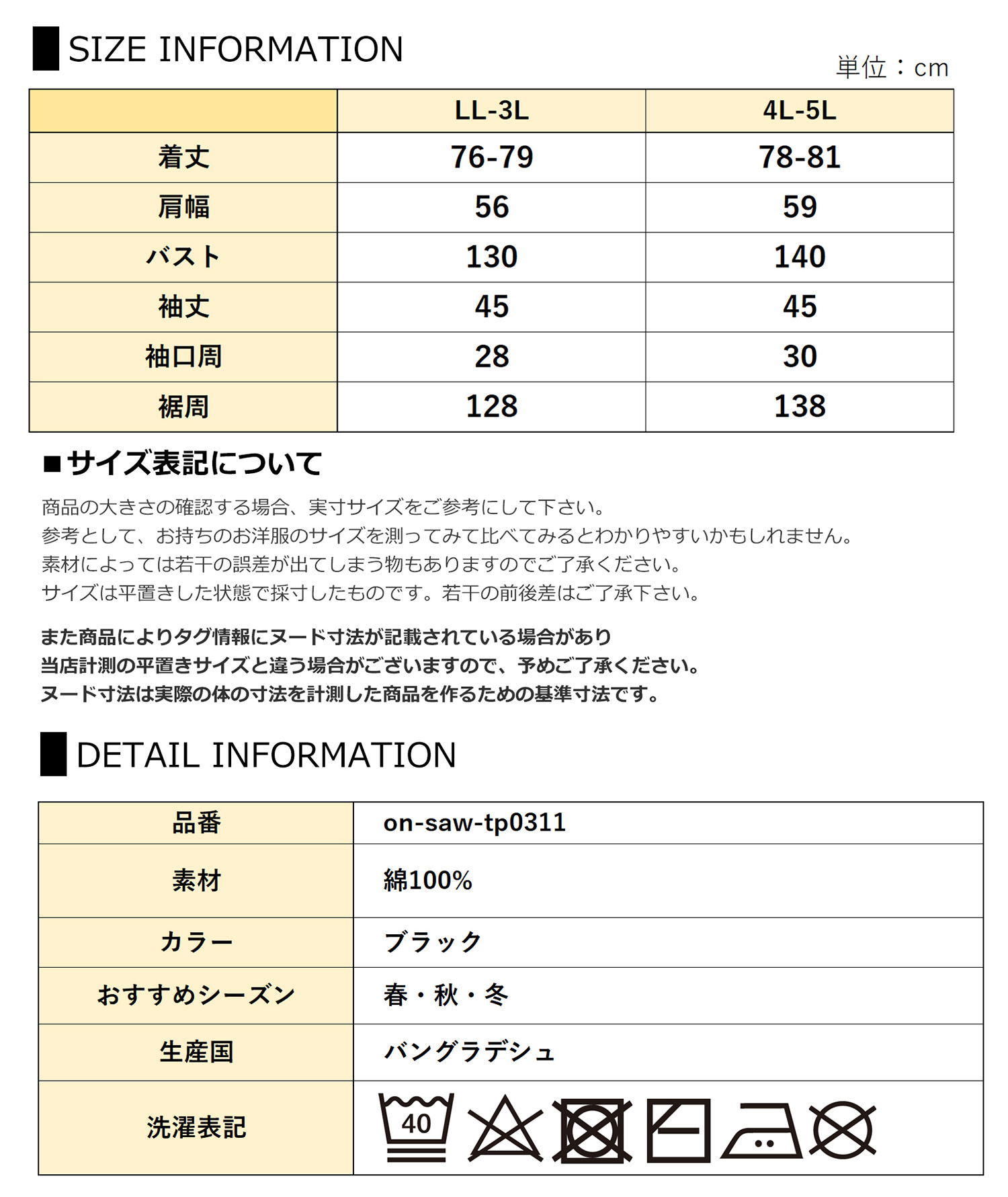 LL-3L:着丈76-79 肩幅56 バスト130 袖丈45 脇周46 袖口周28 裾周128