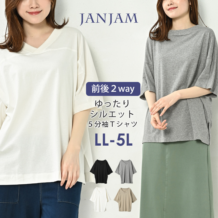 Tシャツ 大きいサイズ レディース メール便送料350円 5分袖 前後2way Uネック Vネック トップス LL-3L 4L-5L
