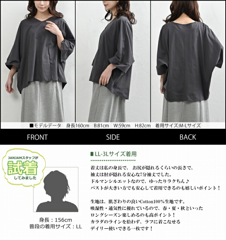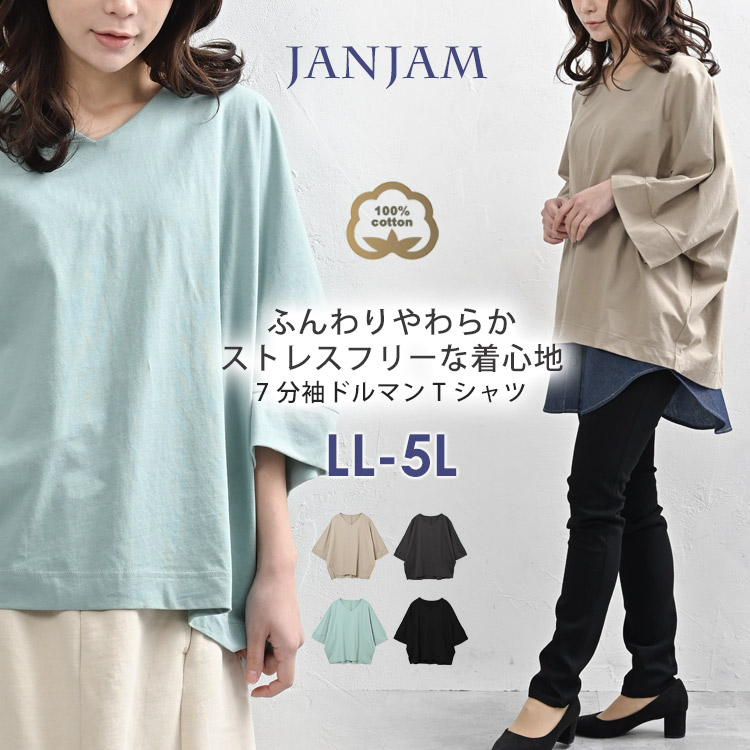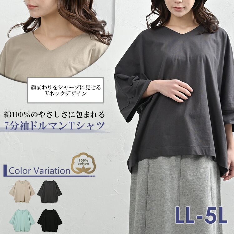 ドルマンTシャツ 大きいサイズ レディース メール便送料350円 7分袖 Vネック カットソー cotton100 トップス LL-3L 4L-5L