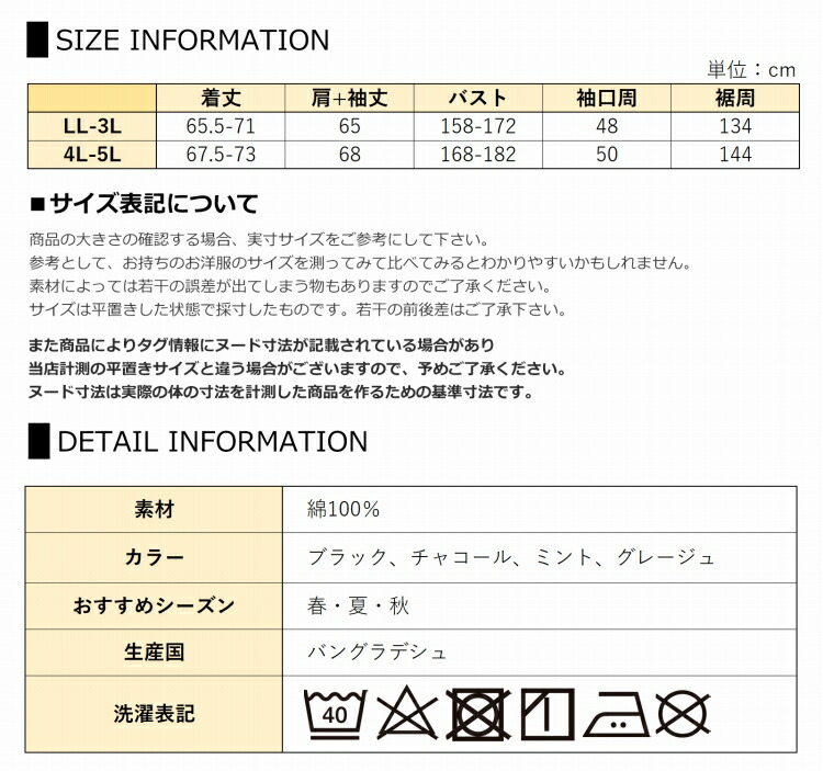 4L-5L:着丈67.5-73 肩+袖丈68 バスト168-182 袖口周50 裾周144