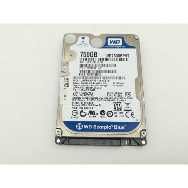 【中古】W.D. Blue WD7500BPVT 750GB/5400rpm/3GbpsSATA/9.5mm/8M【福岡筑紫】保証期間1週間