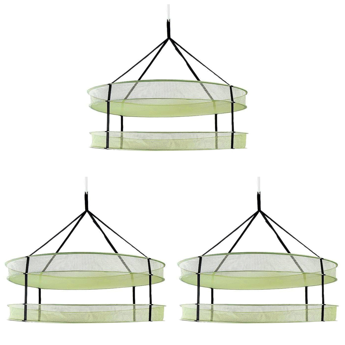 ・素材:メッシュ ・サイズ:直径約約90*フックから下段底まで約80cm ・重量:約493g/個 ・カラー:グリーン ・パッケージ内容:ドライネット*3