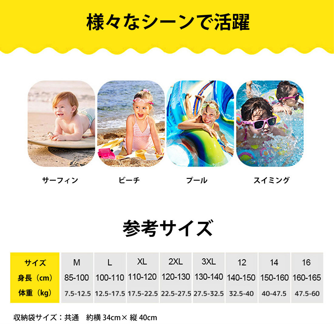 | ・素材:ナイロン82%、スパンデックス18% ・サイズ:L(身長100〜110cm)/XL(身長110〜120cm)/14(身長150〜160cm) ・重量:約240g(L)/260g(XL)/426g(14) ・デザイン:男の子用/女の子用 ・パッケージ内容:長袖ラッシュガード*1、短パン*1、レギンス*1、収納袋*1 ・伸縮性の高く柔らかい生地で、セパレートでお子様ご自身で着脱が楽なのでトイレ時に便利です。 ・長袖タイプなので、日焼け対策もばっちり。スタンドスタイルデザインはネック肌まで守ります。くらげ、害虫や転倒時のケガなどの予防にも。 ・ラッシュガードはジップアップタイプなので、学校のプールやアウトドアなど好みのスタイル・用途でコーデできます。速乾性に優れた生地で、濡れてもすぐに乾きます。海外旅行や夏の海辺、水泳、温泉旅、学校のプール、スイミングにもオススメです。 ・フィット感のあるデザインなので、プールでたくさん動き回りたい元気なこども達におすすめ。丈は少し長めで、お子様が座り込んで砂遊びをしたりしても、背中が出ない様なデザインになっています。 ・お子さまのお肌を守るために、対塩素加工だから塩素入りプールでも安心。UVカット率95%。耐紫外線指数UPF50+夏の紫外線対策はバッチリ。サーフィンとスポーツシーンにビーチやプールはもちろんジムやフィットネスにも使いやすいデザインです。 【ご注意】 ・男女でデザインが異なります。お間違えの無いようご確認の上ご購入ください。 ・定規で測っているため、1~3cmほど誤差がある場合があります。 ・撮影環境やご閲覧の環境により、色味が違って見える場合があります。 ・商品は縫製上の細かいほつれ、インク飛び、織りむら、汚れ、素材特有の臭いや接着剤等の臭いが残っている場合がございますので、気になるお客様はご購入をお控えください。 ・商品写真はできる限り現品を再現するよう心掛けておりますが、ご利用のモニターにより、若干差異が生じる場合がございます。予めご了承ください。 ・梱包にスレや潰れがある場合がございます。予めご了承くださいませ。 ・本製品は生産過程におきまして、生地を織る際の糸の継ぎ目や多少のほつれが生じることがありまが、品質上は問題ありません。また、生地の織りに他繊維が混紡している場合もございます。 ・海外製品の為、縫製が一部粗い場合がございます。あらかじめご了承ください。 ・海外からの輸入品のため、製造ロットやサイズによってデザイン等の仕様が若干異なる場合がございます。予めご了承ください。 ・ストレッチ素材の為、縫製や裁断の際に1〜4cmほど誤差が生じる場合があります。 |