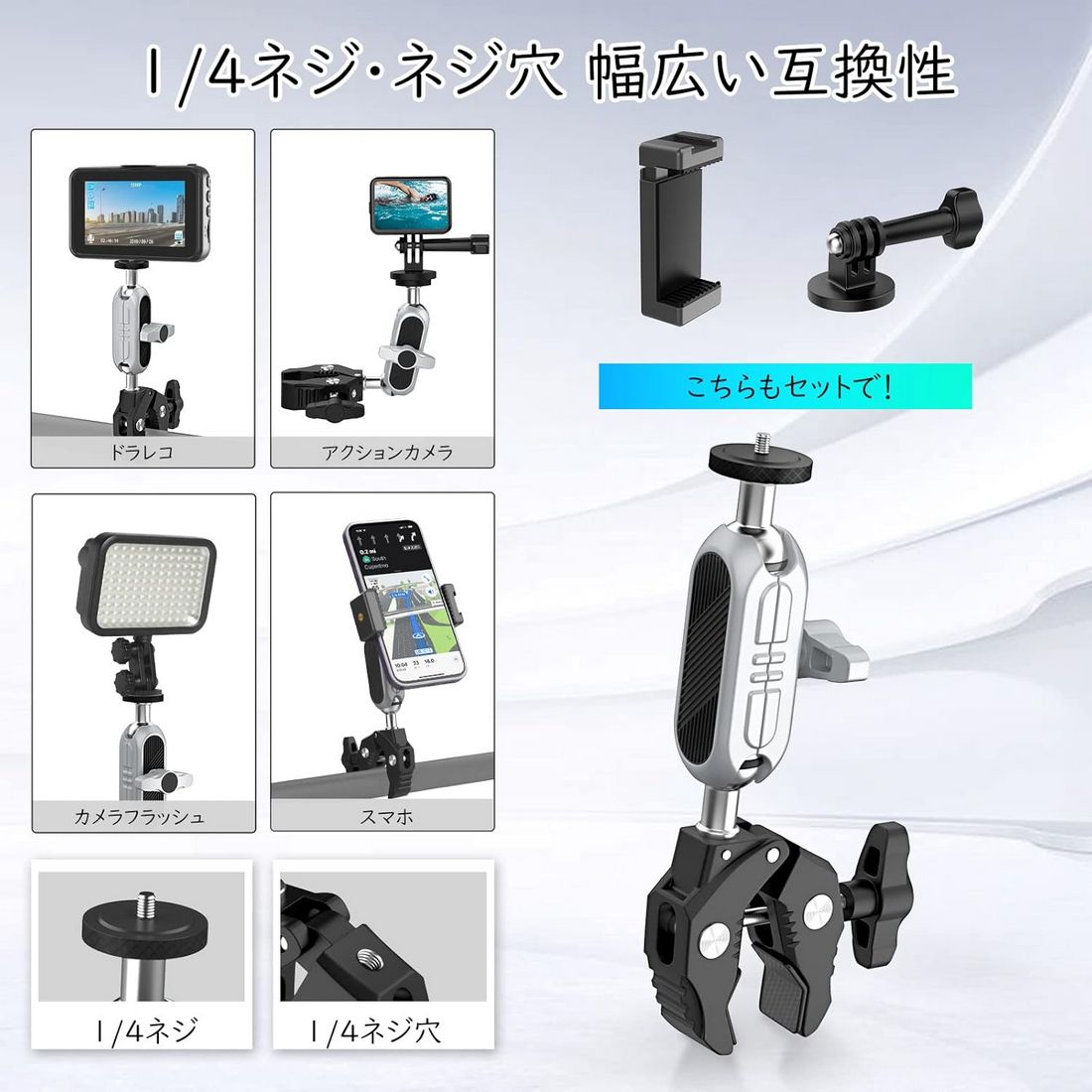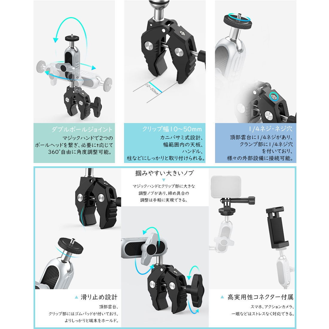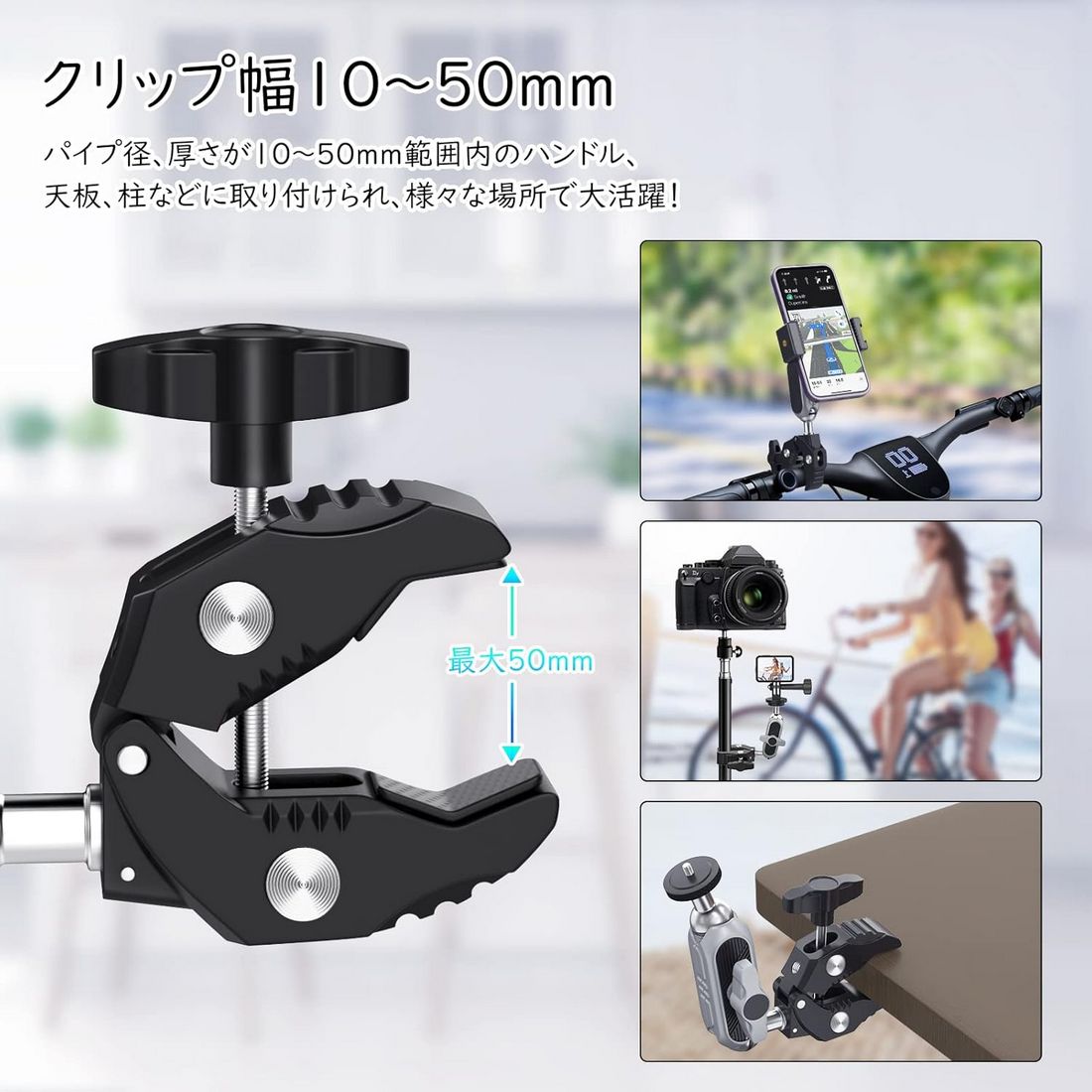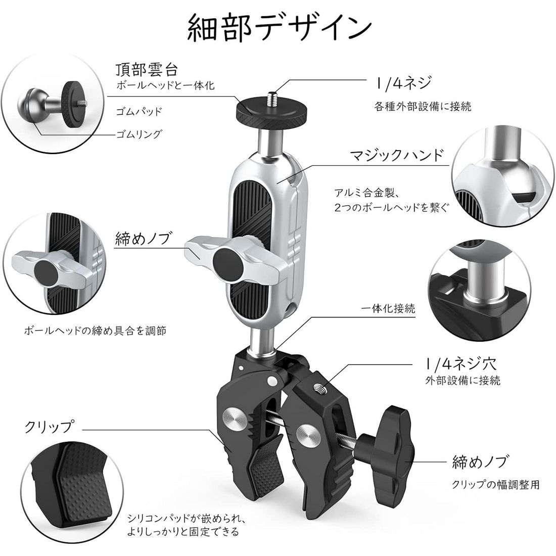 | ・素材:アルミニウム合金 ・サイズ:約幅9*奥行2.5*高さ15cm ・重量:約204g ・最大耐荷重:約1.5kg ・クリップ幅:10〜50mm ・ネジ穴:1/4 ・カラー:シルバー&ブラック ・パッケージ内容:本体*1、スマホクリップ*1、Goproネジ*1、英語取扱説明書*1 ・マジックアームの上下に2つのボールジョイントがありまして、取り付ける場所に応じて、自由に360°回転できます。マジックアームのT字型締めノブでボールヘッドの締め具合を調節でき、必要な角度まで調整して逆方向に回してしっかりと締めばいいです。ご注意:ボールヘッドを緩めないと、頂部雲台を水平方向で回転の時、1/4ねじに接続された設備が落下する恐れがありますので、必ず締め具合を調節してから角度調整してください。 ・カニバサミのような脚は同じくT字型の締めノブで幅を調節します。クリップ幅は10〜50mmあり、幅範囲内の天板、ハンドル、柱などに取り付けられます。さらにクリップ部に滑り止めのゴムが付けられており、より安定した固定を実現できます。 ・カニバサミクランプの他に、スマホ固定用のホルダー及びアクションカメラ、又はそのケージなどに接続できるトライポッド変換マウントが付属されております。それらの拡張アクセサリーがあれば、クランプの適用範囲が大幅に広がります。 ・頂部の雲台に1/4ネジがありまして、アクションカメラや一眼カメラなどに接続できます。クランプ部には1/4穴が設計されており、必要に応じて各種の外部アクセサリーに繋げられ、機能性を更にアップします。 ・パイプ径10〜50mmまで対応、自転車、オートバイ、又は柱などにがっちり掴められ、デスク、棚などの天板にも設置できます。旅中の風景記録、格好いい運動姿の刻み、スマホホルダーを付ければ、気軽にナビの確認ができ、迷わずに前に進めます。 【ご注意】 ・定規で測っているため、1~3cmほど誤差がある場合があります。 ・撮影環境やご閲覧の環境により、色味が違って見える場合があります。 ・海外輸入品の為、多少のキズや汚れ、パッケージへのダメージがある場合がございます。あらかじめご了承ください。 ・説明書は英語のみです。日本語の説明書は付属しておりません。予めご了承ください。 ・スマホやカメラを取付ける際は、ネジのゆるみがないか必ずご確認ください。取付、ご使用時の事故については一切の責任を負いません。予めご了承ください。 |