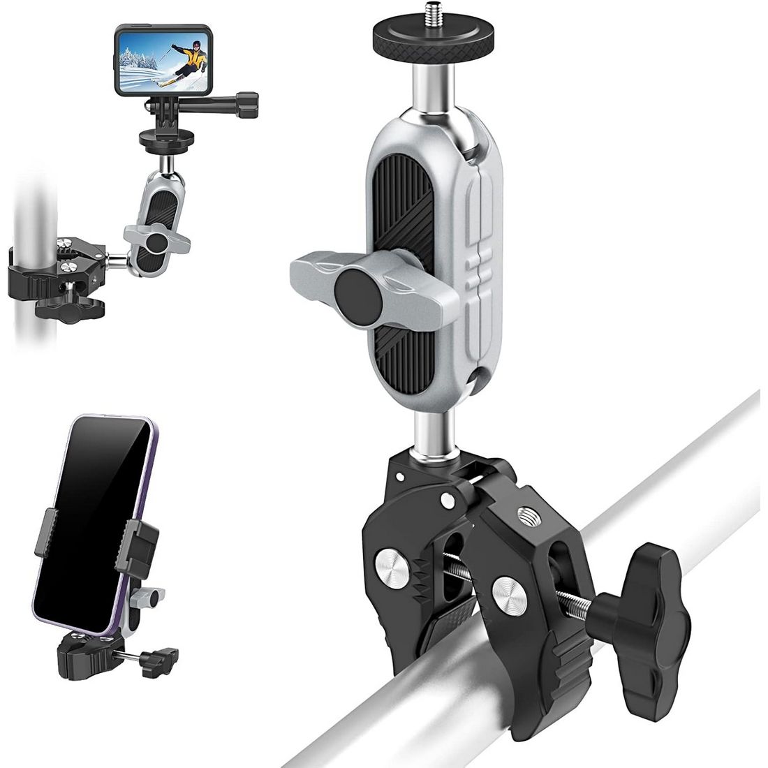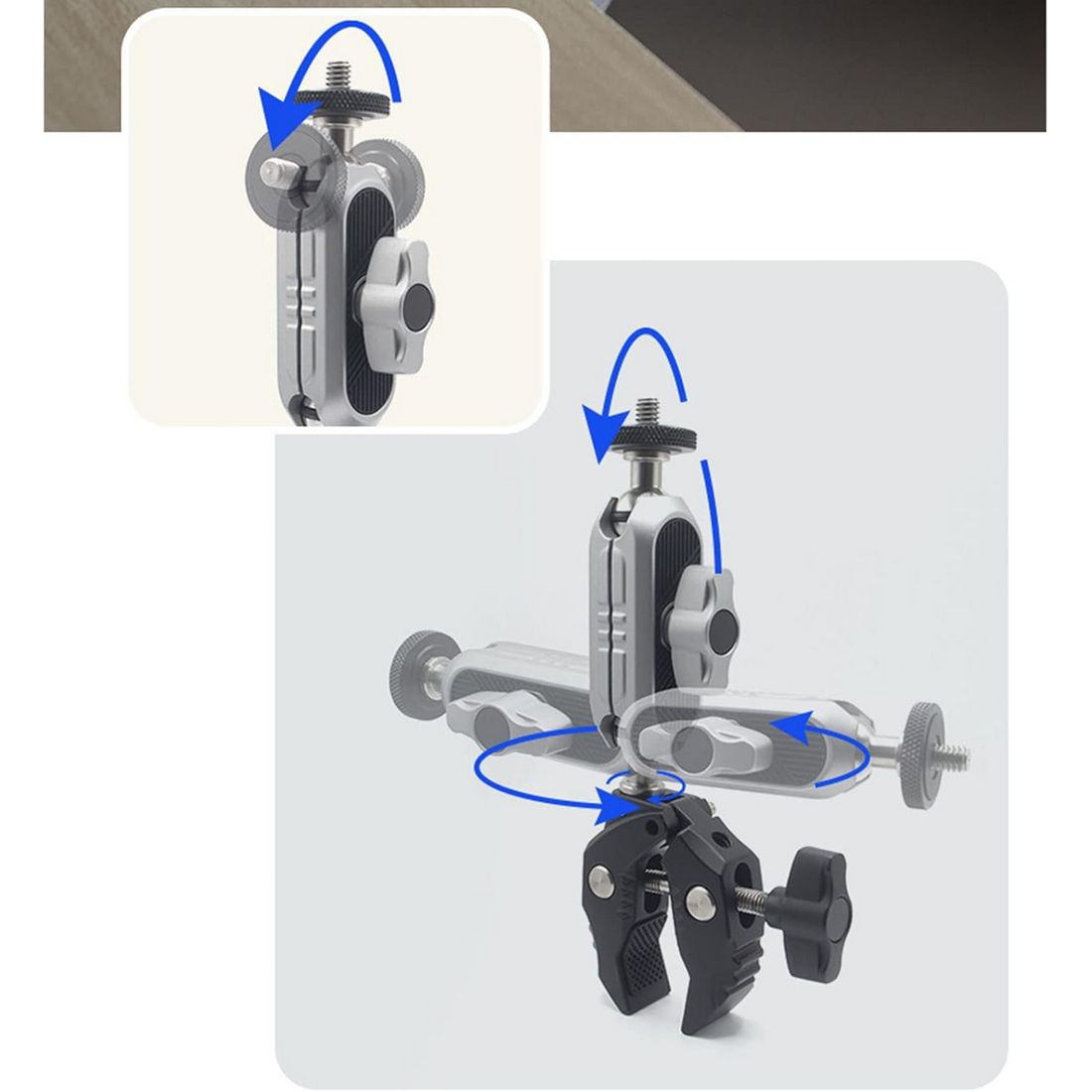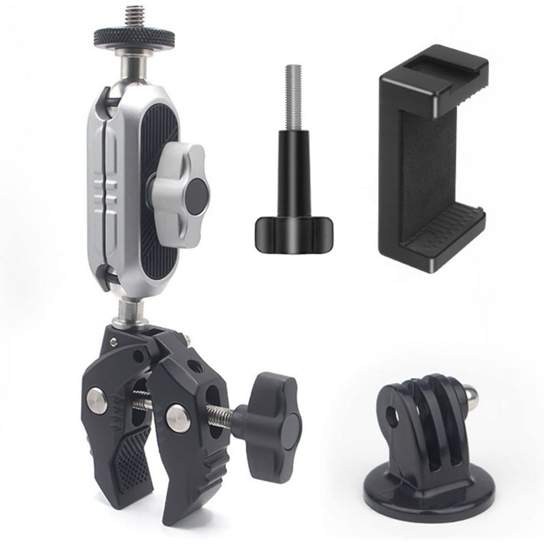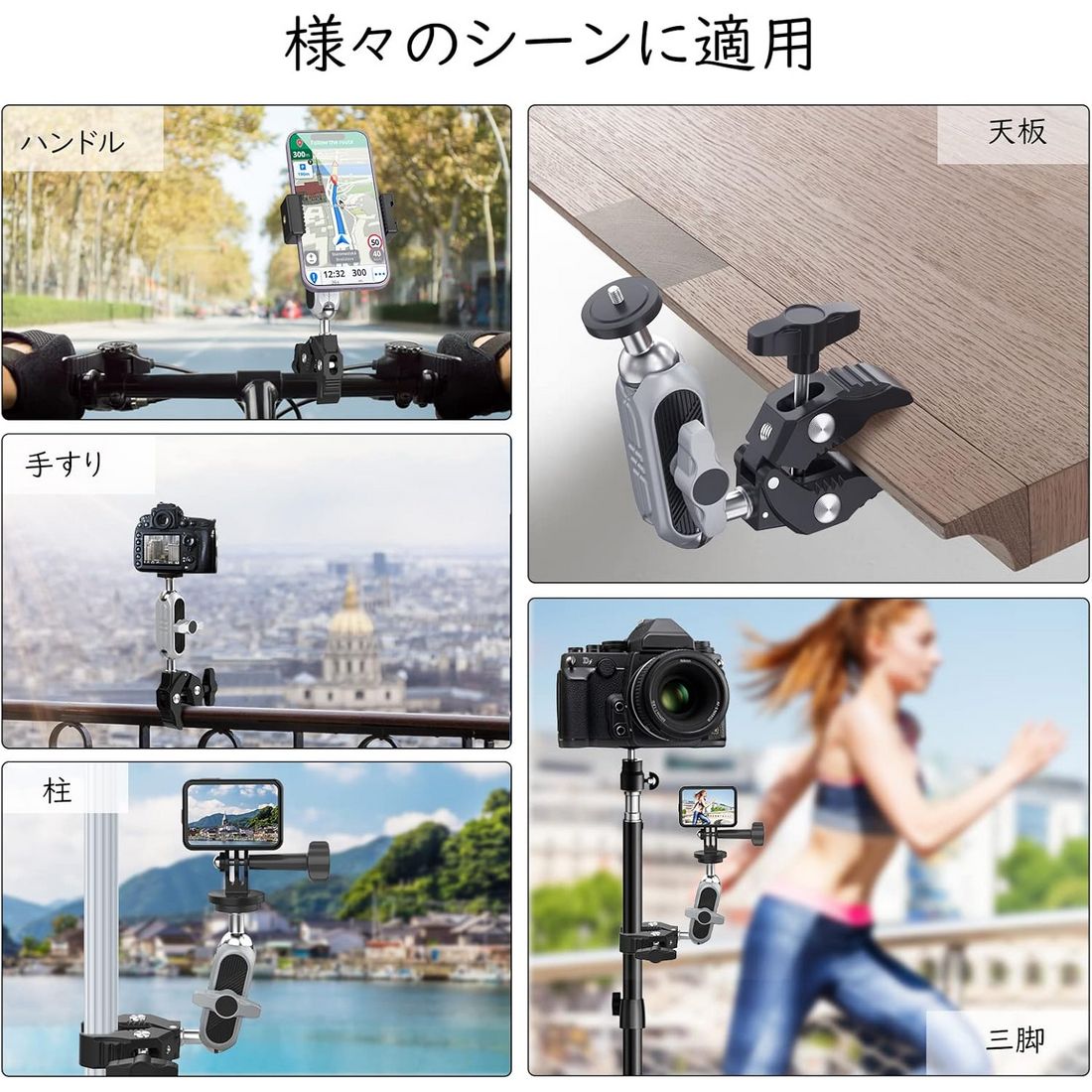 | ・素材:アルミニウム合金 ・サイズ:約幅9*奥行2.5*高さ15cm ・重量:約204g ・最大耐荷重:約1.5kg ・クリップ幅:10〜50mm ・ネジ穴:1/4 ・カラー:シルバー&ブラック ・パッケージ内容:本体*1、スマホクリップ*1、Goproネジ*1、英語取扱説明書*1 ・マジックアームの上下に2つのボールジョイントがありまして、取り付ける場所に応じて、自由に360°回転できます。マジックアームのT字型締めノブでボールヘッドの締め具合を調節でき、必要な角度まで調整して逆方向に回してしっかりと締めばいいです。ご注意:ボールヘッドを緩めないと、頂部雲台を水平方向で回転の時、1/4ねじに接続された設備が落下する恐れがありますので、必ず締め具合を調節してから角度調整してください。 ・カニバサミのような脚は同じくT字型の締めノブで幅を調節します。クリップ幅は10〜50mmあり、幅範囲内の天板、ハンドル、柱などに取り付けられます。さらにクリップ部に滑り止めのゴムが付けられており、より安定した固定を実現できます。 ・カニバサミクランプの他に、スマホ固定用のホルダー及びアクションカメラ、又はそのケージなどに接続できるトライポッド変換マウントが付属されております。それらの拡張アクセサリーがあれば、クランプの適用範囲が大幅に広がります。 ・頂部の雲台に1/4ネジがありまして、アクションカメラや一眼カメラなどに接続できます。クランプ部には1/4穴が設計されており、必要に応じて各種の外部アクセサリーに繋げられ、機能性を更にアップします。 ・パイプ径10〜50mmまで対応、自転車、オートバイ、又は柱などにがっちり掴められ、デスク、棚などの天板にも設置できます。旅中の風景記録、格好いい運動姿の刻み、スマホホルダーを付ければ、気軽にナビの確認ができ、迷わずに前に進めます。 【ご注意】 ・定規で測っているため、1~3cmほど誤差がある場合があります。 ・撮影環境やご閲覧の環境により、色味が違って見える場合があります。 ・海外輸入品の為、多少のキズや汚れ、パッケージへのダメージがある場合がございます。あらかじめご了承ください。 ・説明書は英語のみです。日本語の説明書は付属しておりません。予めご了承ください。 ・スマホやカメラを取付ける際は、ネジのゆるみがないか必ずご確認ください。取付、ご使用時の事故については一切の責任を負いません。予めご了承ください。 |