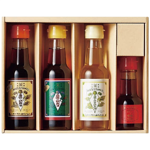 ●商品内容/金口胡麻油・濃口胡麻油・白口胡麻油各140g・岩井のごま辣油55g×各1瓶