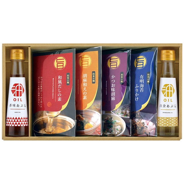 ●商品内容/香味あぶら90g・白金あぶら90g・和風だしの素(4g×3)・胡麻和えの素(5g×2)・かつお味胡麻(4g×2)・有明海苔ふりかけ(5g×2)×各1