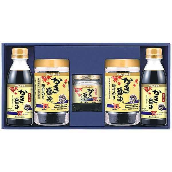 ●商品内容/アサムラサキ かき醤油300ml×2、かき醤油のり佃煮150g×1、かき醤油味付のり(8切30枚)×2●賞味期限/製造から12ヶ月●箱サイズ/約19.5×37.5×7.7cm