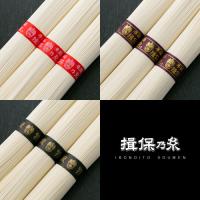 ●商品内容/手延素麺 揖保乃糸 上級品(赤帯):50g×5束、特級品(黒帯):50g×5束、縒りつむぎ(紫帯):50g×5束