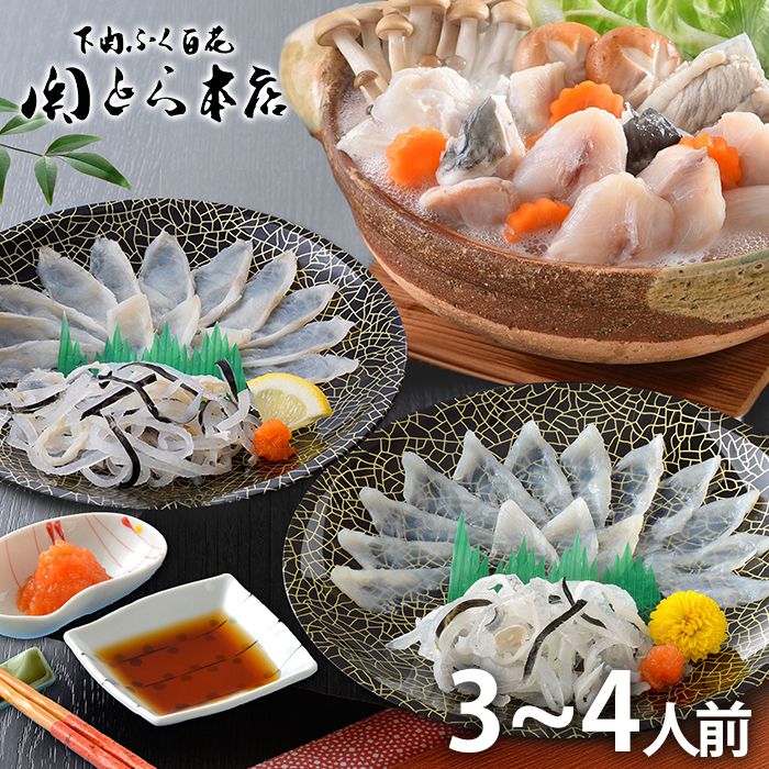 ●商品内容/とらふぐ刺身(15g)×2、真ふぐ霜降り刺身(20g)×2、とらふぐ皮(20g)×4、ふぐちり200g(シロサバフグ切身100g・トラフグアラ100g)×各2、とらふぐ塩辛(60g)、ふくポン酢(100ml)、もみじおろし(10g)×6 ※3〜4人前