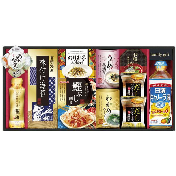 ●商品内容/日清キャノーラ油(400g)・島の香のり佃煮(80g)・有明海産味付け海苔(3切4枚)・のり玉子ふりかけ(4.5g×2)・鰹ぶし削り(2g×4)・うめ茶漬け(4.3g×2)・わかめスープ(5.3g×2)・永谷園お吸いもの松茸風味(2.3g×2)・伊賀越天然醸造しょうゆ(200ml)×各1、玉子スープ(5.4g)×2