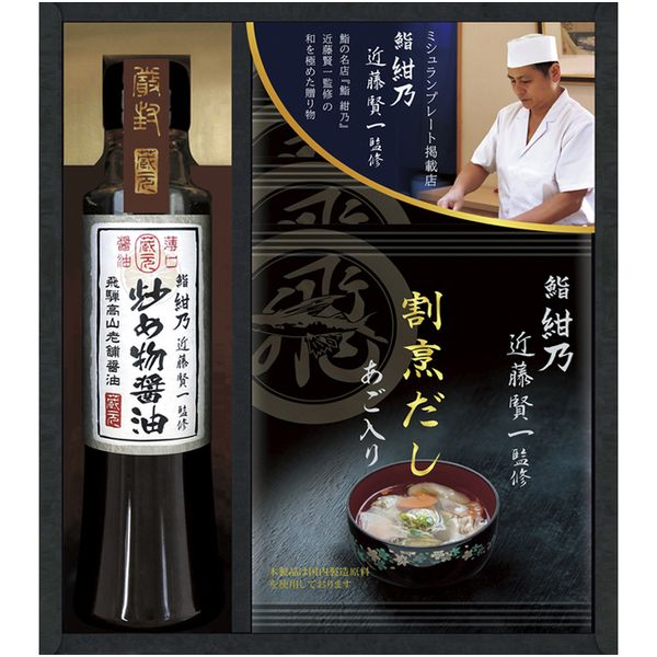 ●商品内容/鮨 紺乃 近藤賢一監修 あご入り割烹だしパック(8g×4)、鮨 紺乃 近藤賢一監修 飛騨高山炒め物醤油(200ml)×1