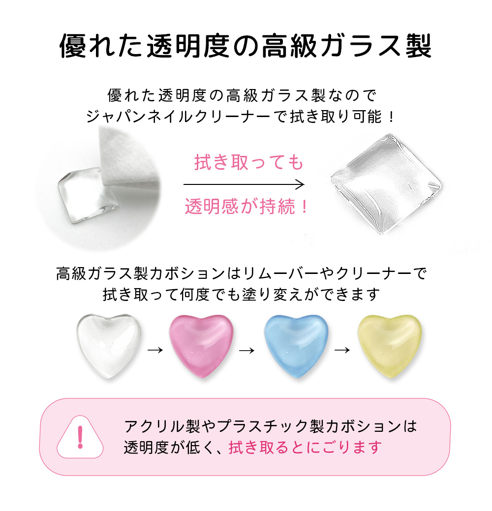 ガラス製はプラスティックやアクリル製よりもジェルリムーバーやジェルクリーナーに強いため、透明感が長く続きます。