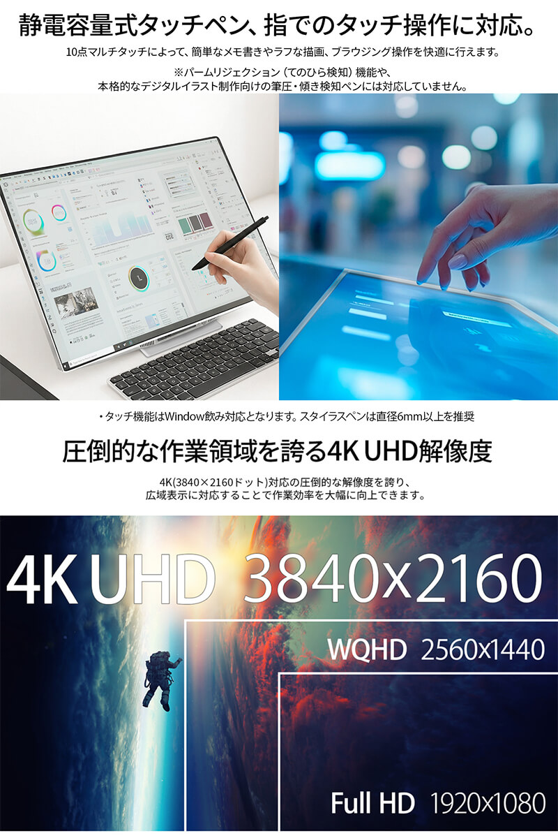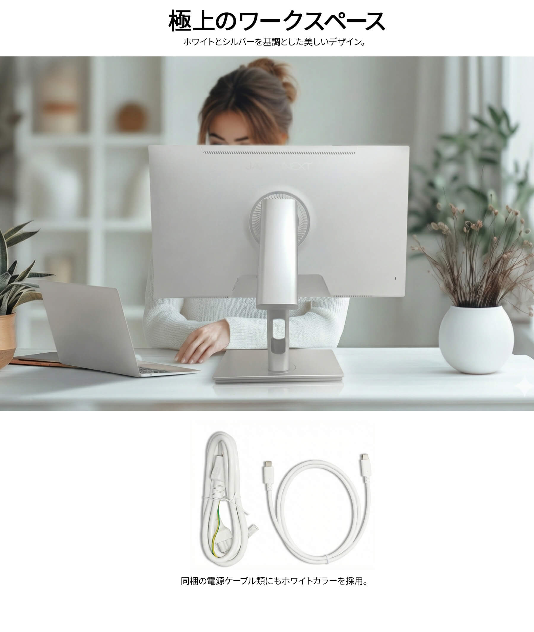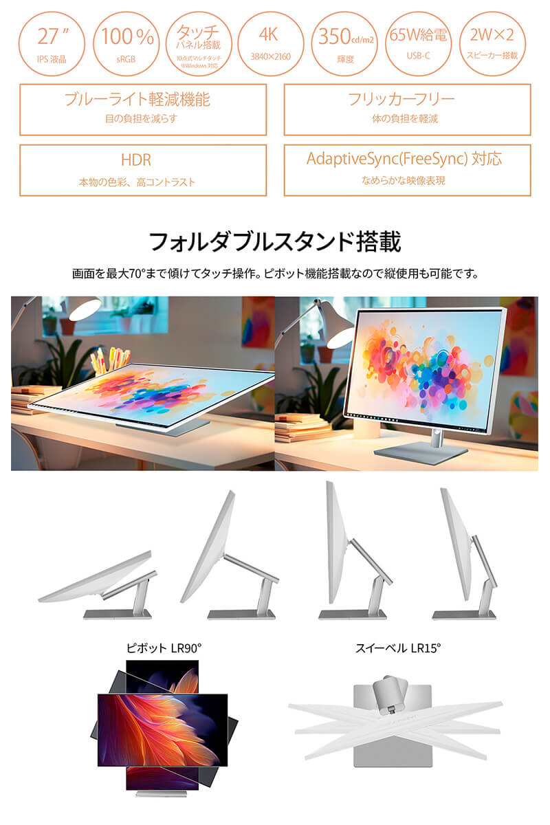 画面を寝かせてタッチ操作も可能なフォルダブルスタンド搭載。滑らかな可動域で、デザイン性と使いやすさを両立し、最適なポジションに簡単に調整できます。最大115mm(横置時)の範囲内で高さ調整ができるだけでなく、水平方向のスイーベル(左右各15度)、角度調整チルト(横置時:-5度〜+70度)も可能です。最大70度までの角度調整と合わせて高さも調整できるので、画面を寝かせた状態でタッチ操作を行うことが可能です。また、縦画面として使用出来るピボット(回転)機能にも対応します。10点マルチタッチに対応しており、Windows PCと接続してピンチズームやスクロールなど直感的なタッチ操作が可能です。※タッチ機能を使用するには、出力機器とモニターをUSB-Cケーブルで接続する必要があります。HDMIまたはDisplayPortで映像を入力する場合は、USB-A to USB-Bケーブルによる接続が別途必要です。ホワイトの本体カラーは、爽やかでおしゃれな空間を演出したい場合や、デバイスを白で統一したい場合に最適です。スタンドにはシルバーカラーを採用し、部屋のアクセントとして最適です。さらに、付属のケーブル、電源アダプターにもホワイトカラーを採用、全体が白基調に統一された部屋や医療機関などでの使用にも最適です。最大輝度350cd/m2の液晶パネルは、sRGB:100%、DCI-P3:95%の広色域に対応し、動画や写真も色鮮やかに美しく表示します。HDR(ハイダイナミックレンジ)に対応。明るい部分も暗い部分もくっきり表現しリアルに迫った深みのある映像を演出します。HDR対応のブルーレイディスクやビデオ・オン・デマンド、ゲームなどの表示が可能です。HDCP2.2対応で4K配信動画もお楽しみ頂けます。インターフェイスはHDMI2.0 x1 (60Hz)、DisplayPort1.4 x1 (60Hz)とUSB-C x1 (60Hz/最大65W給電)を装備し、様々な機器との接続が可能です。USB-C(最大65W給電)は、対応のPCであればUSB-Cケーブル1本でモニターへの映像出力とノートPCへの給電が可能。ケーブル1本でスッキリ接続出来るだけでなく、テレワーク、出社併用の場合などノートPCのACアダプターを持ち運ぶ必要が無くなります。KVM機能に対応。モニターに接続したキーボード、マウスをデスクトップPCやUSB-C接続のノートPCで入力を切り替えた際にもそのまま使用可能です。AdaptiveSync(FreeSync)に対応。画面のリフレッシュレートとコンテンツのフレームレートのズレから生じるティアリングを防ぎ、滑らかで美しい映像を実現します。また、長時間使用時に眼に優しいフリッカーフリー(ちらつき軽減)、ブルーライト軽減モードを搭載します。75x75mmのVESAマウントに対応しますので、別売りのモニターアームなどに使用が可能です。4辺フレームレスデザインを採用し、浮かび上がるようにコンテンツを鮮やかに映し出します。2Wx2のスピーカーを搭載します。本製品には、2年間のメーカー保証が付きます。