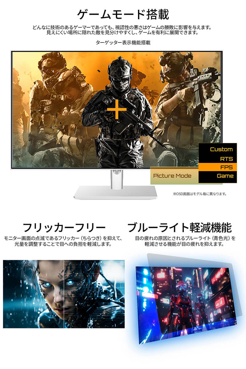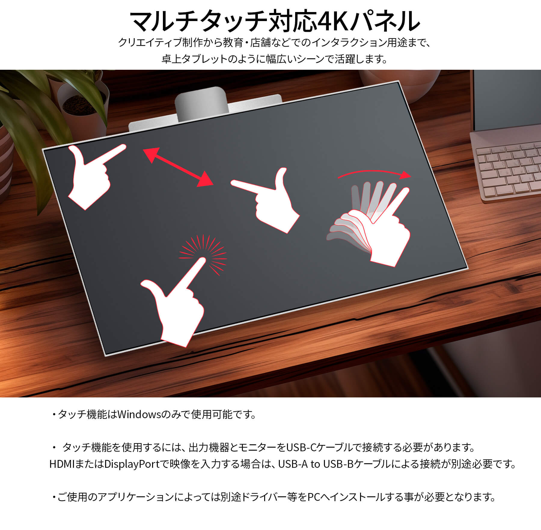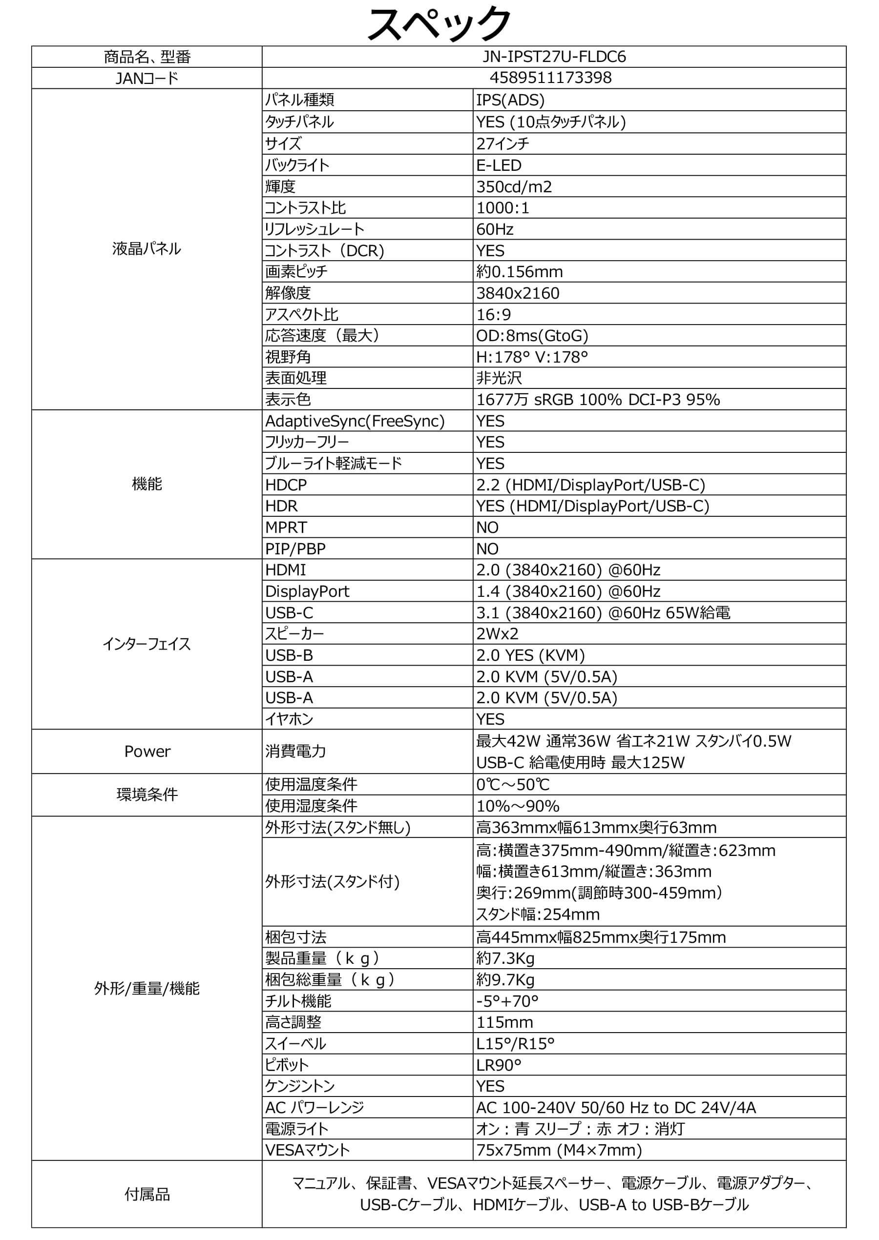 画面を寝かせてタッチ操作も可能なフォルダブルスタンド搭載。滑らかな可動域で、デザイン性と使いやすさを両立し、最適なポジションに簡単に調整できます。最大115mm(横置時)の範囲内で高さ調整ができるだけでなく、水平方向のスイーベル(左右各15度)、角度調整チルト(横置時:-5度〜+70度)も可能です。最大70度までの角度調整と合わせて高さも調整できるので、画面を寝かせた状態でタッチ操作を行うことが可能です。また、縦画面として使用出来るピボット(回転)機能にも対応します。10点マルチタッチに対応しており、Windows PCと接続してピンチズームやスクロールなど直感的なタッチ操作が可能です。※タッチ機能を使用するには、出力機器とモニターをUSB-Cケーブルで接続する必要があります。HDMIまたはDisplayPortで映像を入力する場合は、USB-A to USB-Bケーブルによる接続が別途必要です。ホワイトの本体カラーは、爽やかでおしゃれな空間を演出したい場合や、デバイスを白で統一したい場合に最適です。スタンドにはシルバーカラーを採用し、部屋のアクセントとして最適です。さらに、付属のケーブル、電源アダプターにもホワイトカラーを採用、全体が白基調に統一された部屋や医療機関などでの使用にも最適です。最大輝度350cd/m2の液晶パネルは、sRGB:100%、DCI-P3:95%の広色域に対応し、動画や写真も色鮮やかに美しく表示します。HDR(ハイダイナミックレンジ)に対応。明るい部分も暗い部分もくっきり表現しリアルに迫った深みのある映像を演出します。HDR対応のブルーレイディスクやビデオ・オン・デマンド、ゲームなどの表示が可能です。HDCP2.2対応で4K配信動画もお楽しみ頂けます。インターフェイスはHDMI2.0 x1 (60Hz)、DisplayPort1.4 x1 (60Hz)とUSB-C x1 (60Hz/最大65W給電)を装備し、様々な機器との接続が可能です。USB-C(最大65W給電)は、対応のPCであればUSB-Cケーブル1本でモニターへの映像出力とノートPCへの給電が可能。ケーブル1本でスッキリ接続出来るだけでなく、テレワーク、出社併用の場合などノートPCのACアダプターを持ち運ぶ必要が無くなります。KVM機能に対応。モニターに接続したキーボード、マウスをデスクトップPCやUSB-C接続のノートPCで入力を切り替えた際にもそのまま使用可能です。AdaptiveSync(FreeSync)に対応。画面のリフレッシュレートとコンテンツのフレームレートのズレから生じるティアリングを防ぎ、滑らかで美しい映像を実現します。また、長時間使用時に眼に優しいフリッカーフリー(ちらつき軽減)、ブルーライト軽減モードを搭載します。75x75mmのVESAマウントに対応しますので、別売りのモニターアームなどに使用が可能です。4辺フレームレスデザインを採用し、浮かび上がるようにコンテンツを鮮やかに映し出します。2Wx2のスピーカーを搭載します。本製品には、2年間のメーカー保証が付きます。