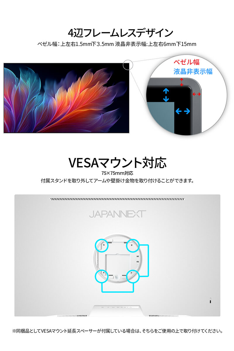 付属品:マニュアル、 保証書、 VESAマウント延長スペーサー、 電源ケーブル、 電源アダプター、 USB-Cケーブル、 HDMIケーブル、 USB-A to USB-Bケーブル