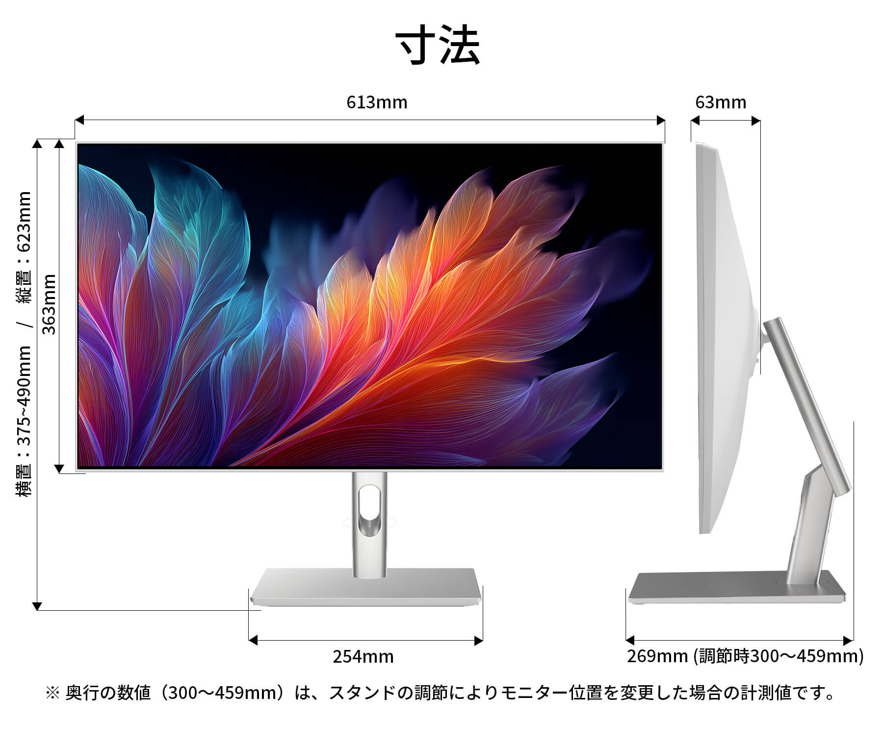 外形寸法(スタンド付):高:横置き375mm-490mm/縦置き:623mm幅:横置き613mm/縦置き:363mm奥行:269mm(調節時300-459mm)スタンド幅:254mm