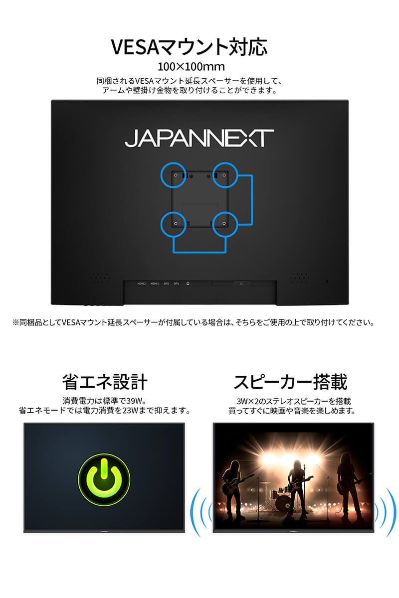 付属品:マニュアル保証書VESAマウント延長スペーサー電源ケーブルHDMIケーブル