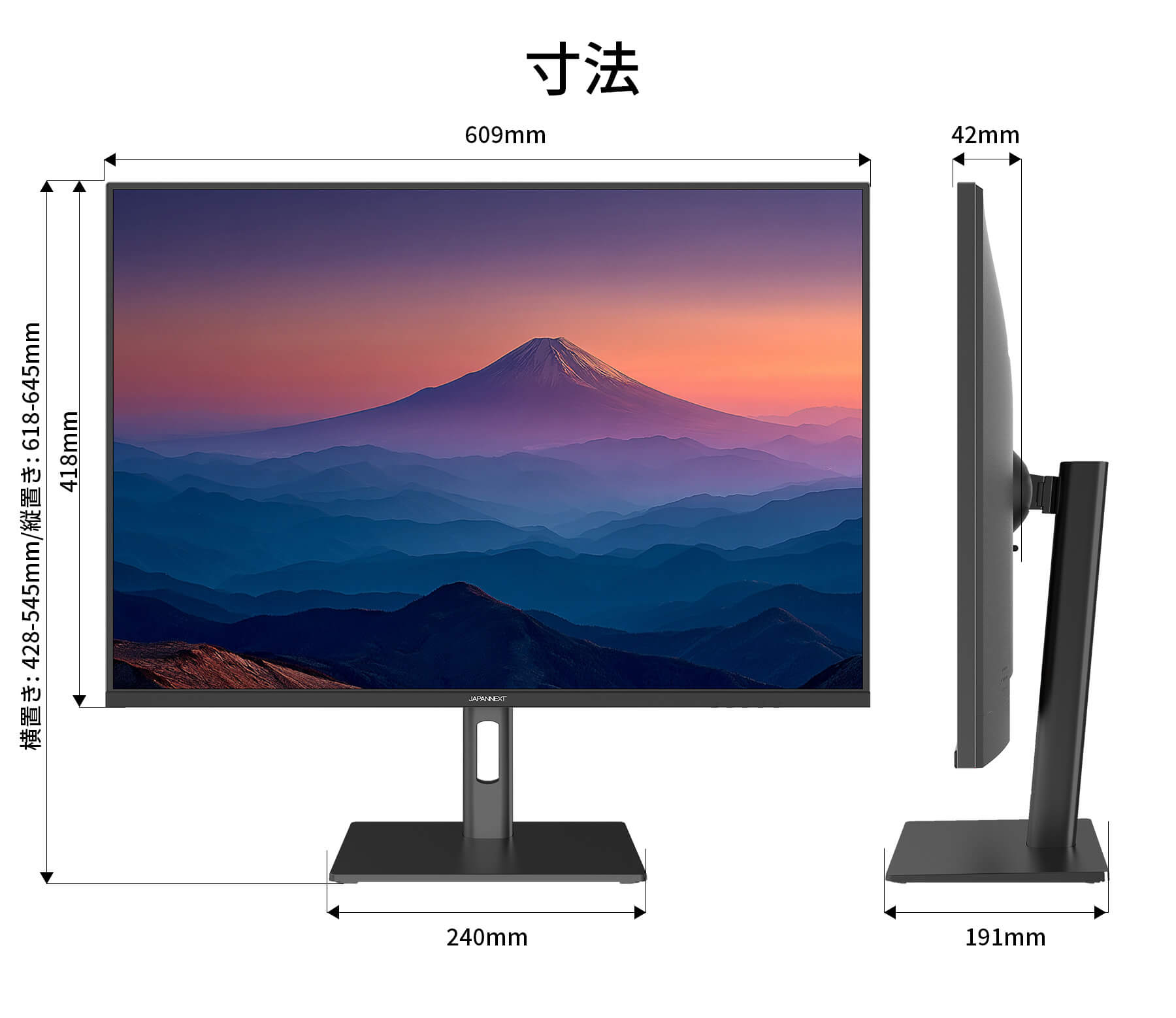 外形寸法(スタンド付):高さ 横置き:428-545mm 縦置き:618-645mm幅 横置き:609mm縦418mm奥行191mmスタンド幅240mm