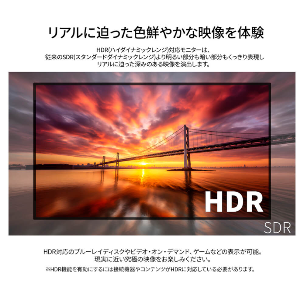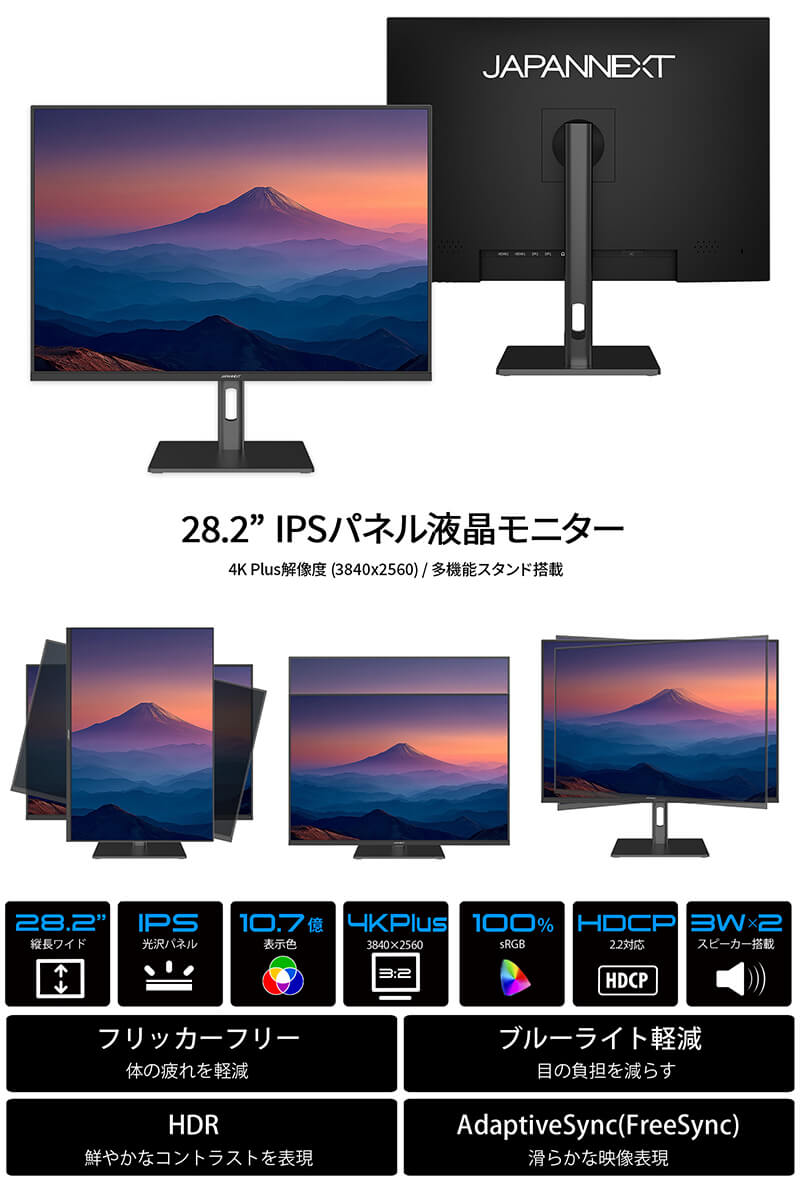 アスペクト比3:2の液晶モニターは、縦方向の表示領域が広いため、スクロールが少なく効率的に作業できます。文書やプログラムの編集、写真の表示に適しており、自然な画面分割でマルチタスクも快適です。あらゆる角度から見ても色やコントラストの変化がおきにくいIPSパネルを搭載し、広視野角上下左右178°を実現します。最大輝度340cd/m2の液晶パネルはsRGB:100%、DCI-P3:95%の広色域に対応し、写真や動画編集などの作業にも最適です。HDR(ハイダイナミックレンジ)は、明るい部分も暗い部分もくっきり表現し、リアルに迫った深みのある映像を演出します。HDR対応のブルーレイディスクやビデオ・オン・デマンド、ゲームなどの表示が可能。現実に近い美しい映像をお楽しみください。高さ調整が可能な昇降式多機能スタンドを搭載、最大110mmの範囲(横置時)で最適な高さに画面を調整可能です。また、縦画面として使用出来るピボット(回転)機能にも対応します。スイーベル(首振り)機能は、左右各25°の範囲で動かせます。インターフェイスは、HDMI 2.0×2 (50Hz)、DisplayPort 1.4×2 (60Hz)を装備し、様々な機器との接続が可能です。複数の入力映像を同時に表示するPIP(Picture In Picture)とPBP(Picture By Picture)に対応、PIPではもう一つの入力画面を子画面(左上/右上/左下/右下から選択)で同時表示が可能。PBPでは2つの入力を左右に同時表示することが可能です。モニター画面のフリッカー(ちらつき)、およびブルーライト(青色光)を軽減し、目の負担を軽くします。100×100mmのVESAマウントに対応しますので、別売りのモニターアームなどに使用が可能です。3W×2のスピーカーを搭載します。本製品には、2年間のメーカー保証が付きます。