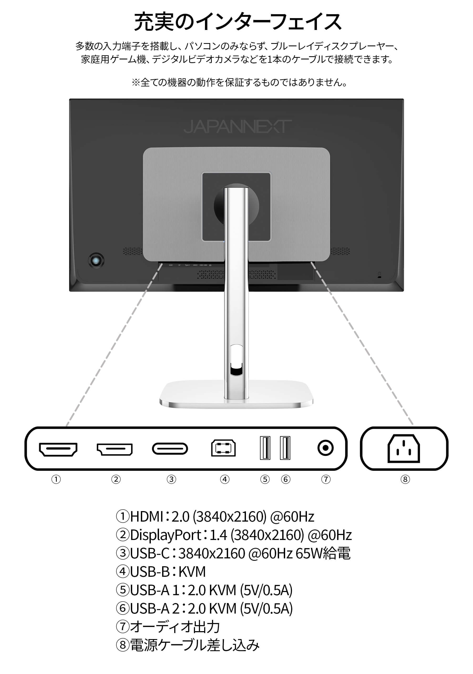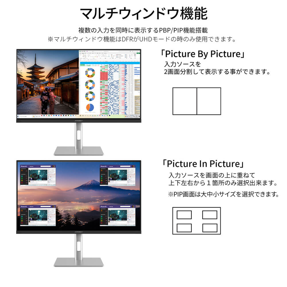 あらゆる角度から見ても色やコントラストの変化がおきにくいIPSパネルを搭載し、広視野角上下左右178°を実現します。本製品のIPSパネルは、より深い黒の表現を可能にすることで、色彩の豊かさと正確性を一段と高めています。従来のIPSパネルと比べて非常に高いコントラスト比「2000:1」を実現し、優れた色再現性はプロフェッショナルワークにも最適です。最大輝度400cd/m2、sRGB:100%、DCI-P3:98%の広色域に対応した液晶パネルは、HDR400相当の性能を持ち、コンテンツを色鮮やかに映し出します。HDR(ハイダイナミックレンジ)に対応。明るい部分も暗い部分もくっきり表現しリアルに迫った深みのある映像を演出します。HDR対応のブルーレイディスクやビデオ・オン・デマンド、ゲームなどの表示が可能です。HDCP2.2対応で4K配信動画もお楽しみ頂けます。高さ調整が可能な昇降式多機能スタンドを搭載、最大140mmの範囲(横置時)で最適な高さに画面を調整可能です。また、縦画面として使用出来るピボット(回転)機能にも対応します。スイーベル(首振り)機能は、左右各30°の範囲で動かせます。インターフェイスはHDMI2.0 x1 (60Hz)、DisplayPort1.4 x1 (60Hz)とUSB-C x1 (60Hz/最大65W給電)を装備し、様々な機器との接続が可能です。USB-C(最大65W給電)は、対応のPCであればUSB-Cケーブル1本でモニターへの映像出力とノートPCへの給電が可能。ケーブル1本でスッキリ接続出来るだけでなく、テレワーク、出社併用の場合などノートPCのACアダプターを持ち運ぶ必要が無くなります。複数の入力を同時に表示する「PBP(Picture by Picture)」に対応、PBPモードでは、最大2つの入力映像を左右同時に表示可能。入力の一つを子画面にて表示する「PIP(Picture in Picture)」も可能です。KVM機能に対応。モニターに接続したキーボード、マウスをデスクトップPCやUSB-C接続のノートPCで入力を切り替えた際にもそのまま使用可能です。100x100mmのVESAマウントに対応しますので、別売りのモニターアームなどに使用が可能です。2Wx2のスピーカーを搭載します。本製品には、2年間のメーカー保証が付きます。