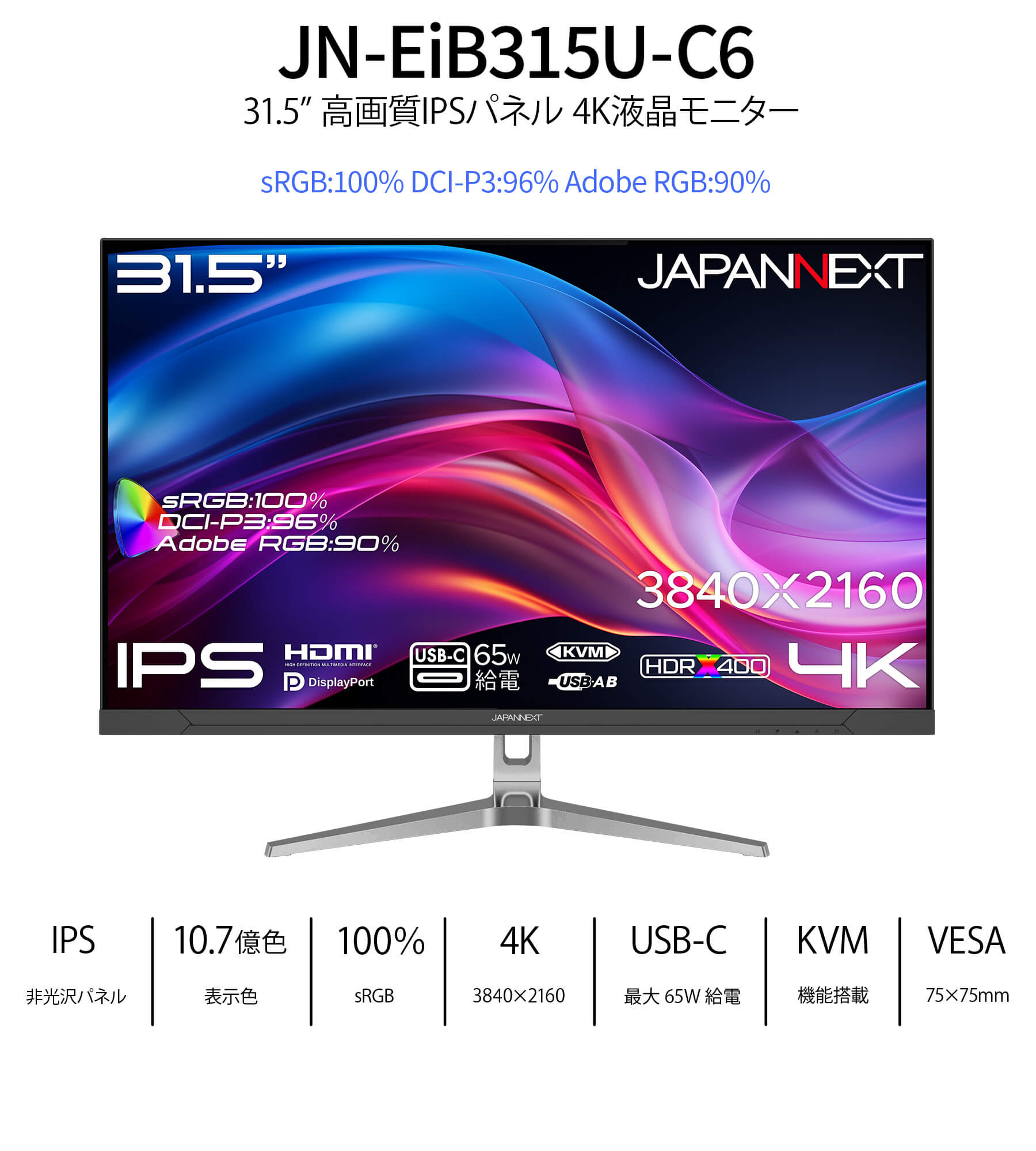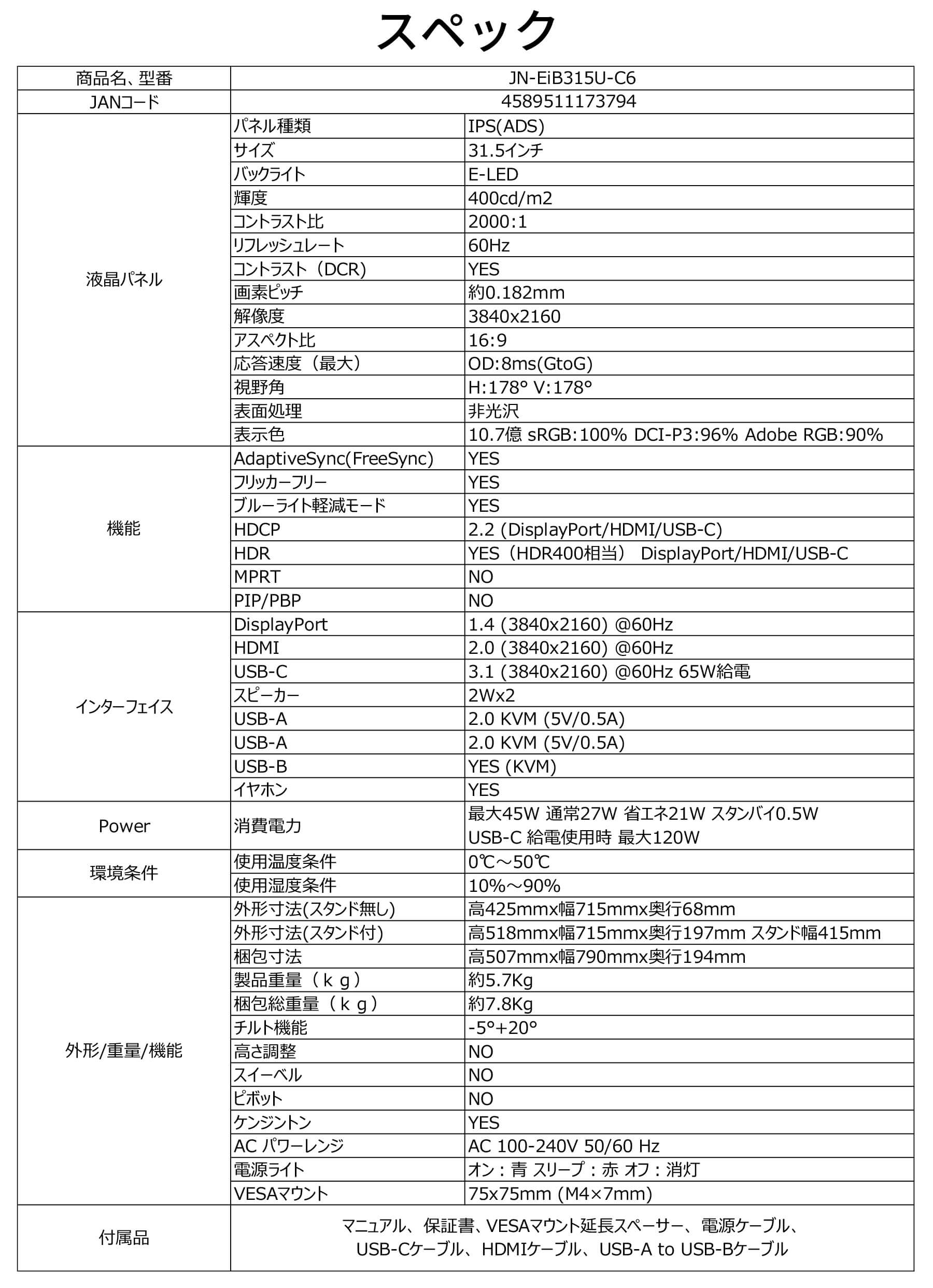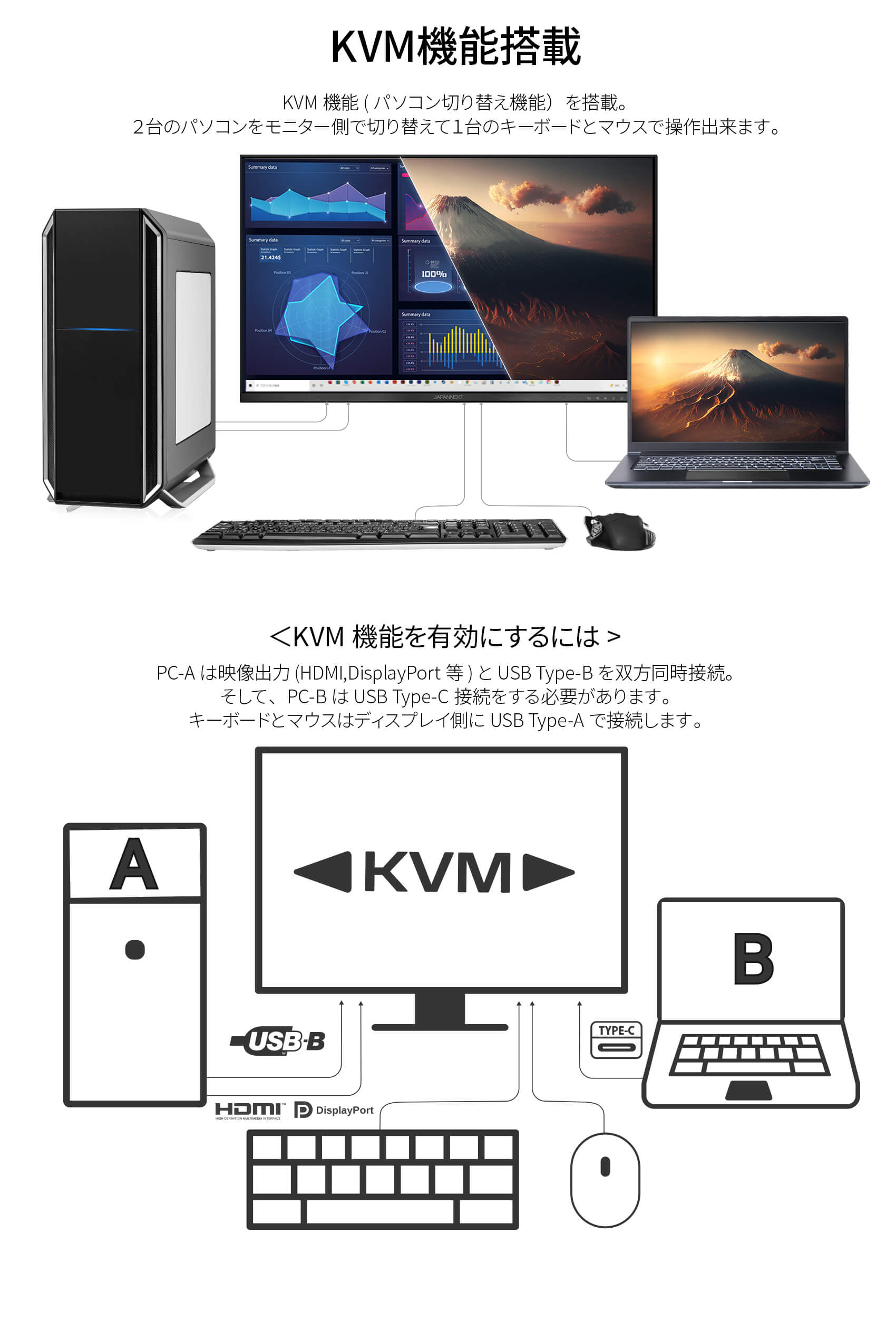 あらゆる角度から見ても色やコントラストの変化がおきにくいIPSパネルを搭載し、広視野角上下左右178°を実現します。本製品のIPSパネルは、より深い黒の表現を可能にすることで、色彩の豊かさと正確性を一段と高めています。従来のIPSパネルと比べて非常に高いコントラスト比「2000:1」を実現し、優れた色再現性はプロフェッショナルワークにも最適です。最大輝度400cd/m2、sRGB:100%、DCI-P3:96%、Adobe RGB:90%の広色域に対応した液晶パネルは、HDR400相当の性能を持ち、コンテンツを色鮮やかに映し出します。HDR(ハイダイナミックレンジ)は、明るい部分も暗い部分もくっきり表現し、リアルに迫った深みのある映像を演出します。HDR対応のブルーレイディスクやビデオ・オン・デマンド、ゲームなどの表示が可能。現実に近い美しい映像をお楽しみください。インターフェイスは、HDMI 2.0 x1 (60Hz)、DisplayPort 1.4 x1 (60Hz)とUSB-C x1 (60Hz/最大65W給電)を装備し、様々な機器との接続が可能です。USB-C(最大65W給電)は、対応のPCであればUSB-Cケーブル1本でモニターへの映像出力とノートPCへの給電が可能。ケーブル1本でスッキリ接続出来るだけでなく、テレワーク、出社併用の場合などノートPCのACアダプターを持ち運ぶ必要が無くなります。KVM機能に対応。モニターに接続したキーボード、マウスをデスクトップPCやUSB-C接続のノートPCで入力を切り替えた際にもそのまま使用可能です。モニター画面のフリッカー(ちらつき)、およびブルーライト(青色光)を軽減し、目の負担を軽くします。75x75mmのVESAマウントに対応しますので、別売りのモニターアームなどに使用が可能です。2Wx2のスピーカーを搭載します。本製品には、2年間のメーカー保証が付きます。