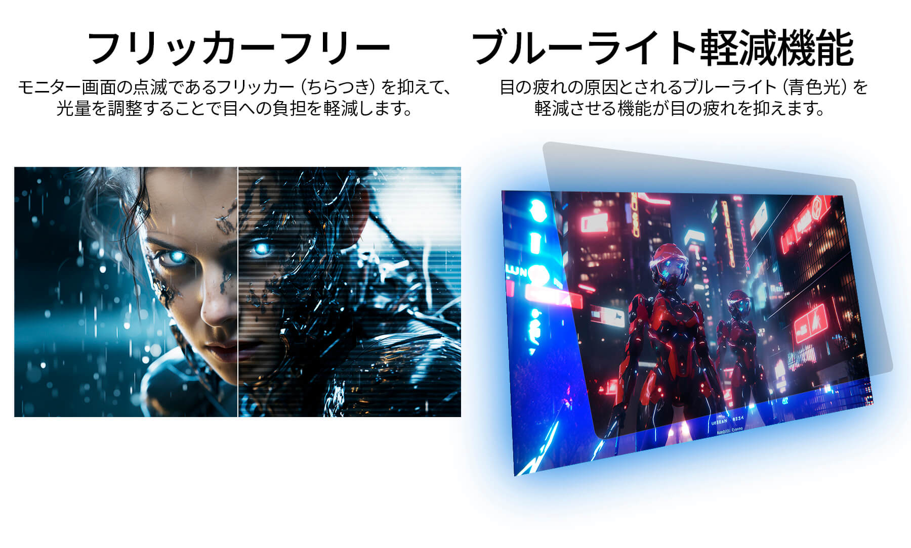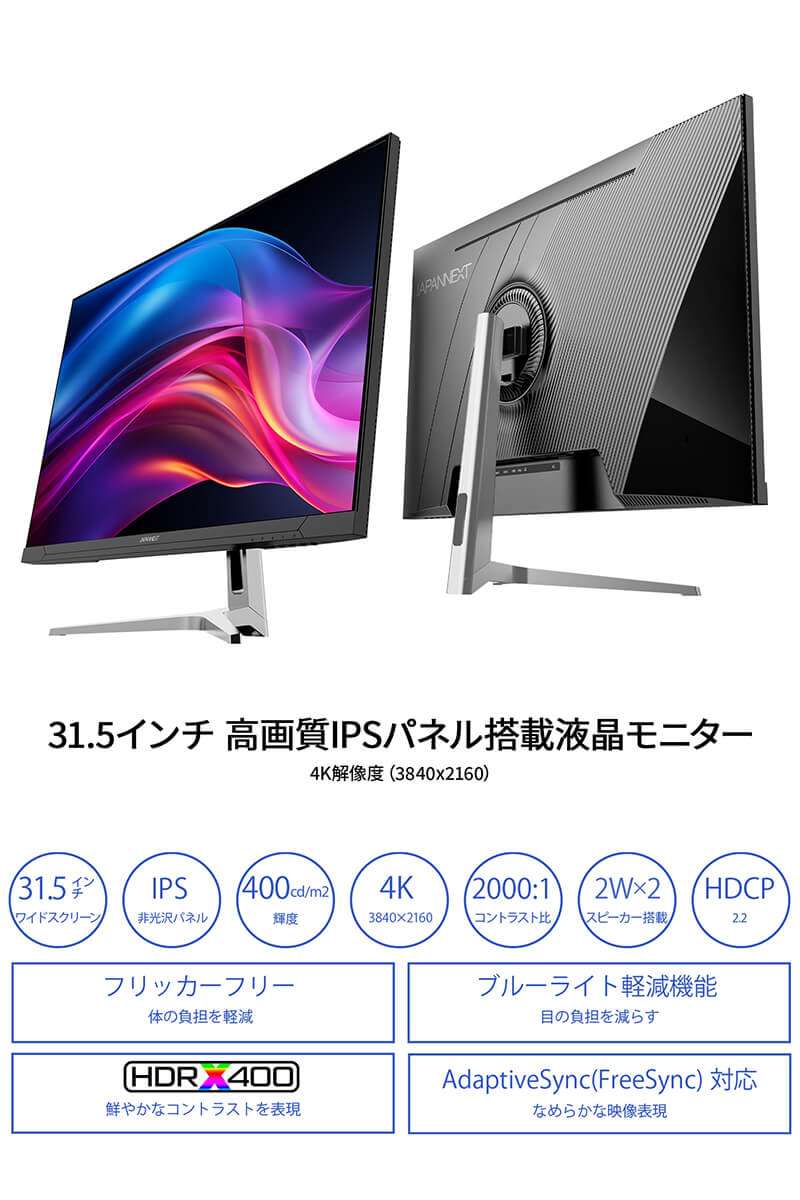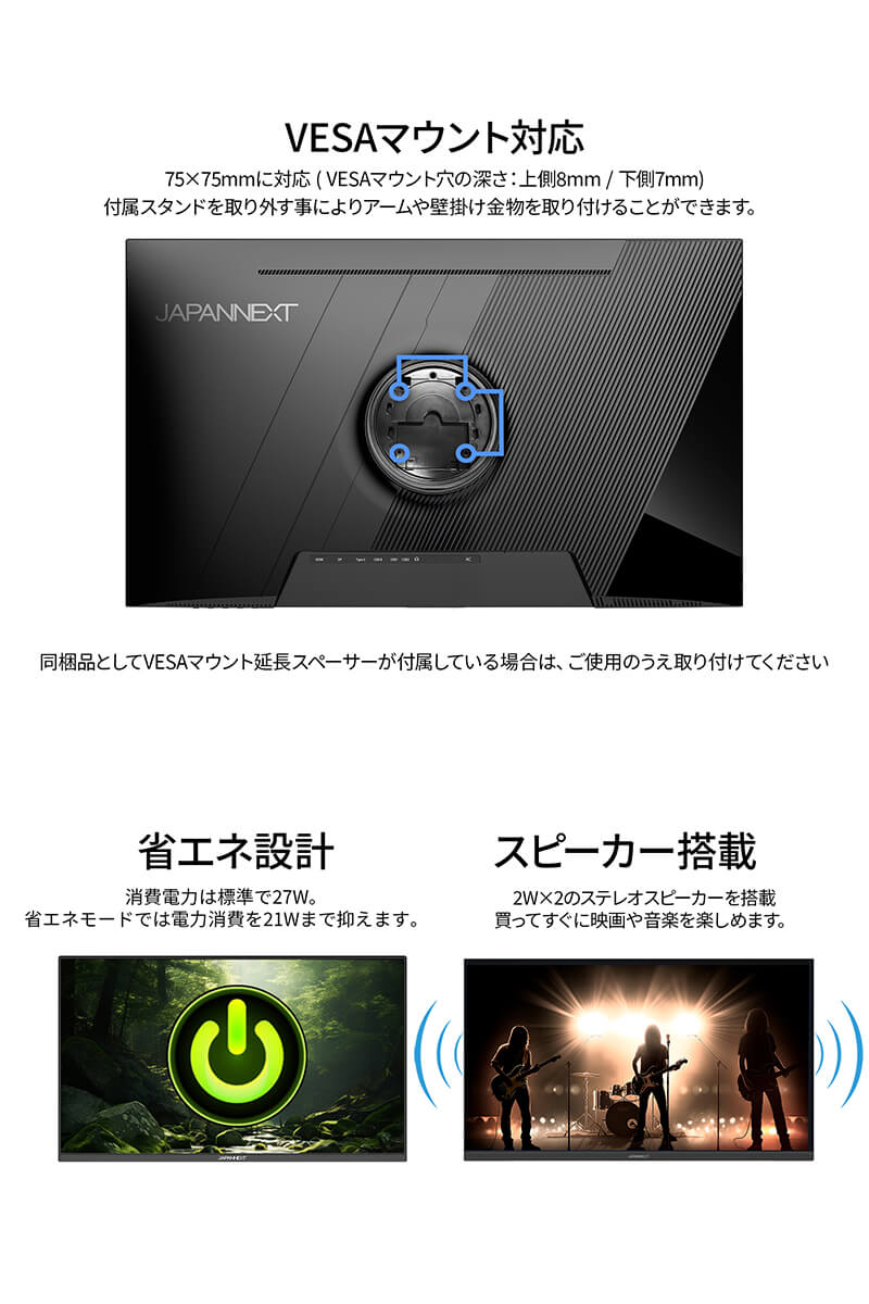 あらゆる角度から見ても色やコントラストの変化がおきにくいIPSパネルを搭載し、広視野角上下左右178°を実現します。本製品のIPSパネルは、より深い黒の表現を可能にすることで、色彩の豊かさと正確性を一段と高めています。従来のIPSパネルと比べて非常に高いコントラスト比「2000:1」を実現し、優れた色再現性はプロフェッショナルワークにも最適です。最大輝度400cd/m2、sRGB:100%、DCI-P3:96%、Adobe RGB:90%の広色域に対応した液晶パネルは、HDR400相当の性能を持ち、コンテンツを色鮮やかに映し出します。HDR(ハイダイナミックレンジ)は、明るい部分も暗い部分もくっきり表現し、リアルに迫った深みのある映像を演出します。HDR対応のブルーレイディスクやビデオ・オン・デマンド、ゲームなどの表示が可能。現実に近い美しい映像をお楽しみください。インターフェイスは、HDMI 2.0 x1 (60Hz)、DisplayPort 1.4 x1 (60Hz)とUSB-C x1 (60Hz/最大65W給電)を装備し、様々な機器との接続が可能です。USB-C(最大65W給電)は、対応のPCであればUSB-Cケーブル1本でモニターへの映像出力とノートPCへの給電が可能。ケーブル1本でスッキリ接続出来るだけでなく、テレワーク、出社併用の場合などノートPCのACアダプターを持ち運ぶ必要が無くなります。KVM機能に対応。モニターに接続したキーボード、マウスをデスクトップPCやUSB-C接続のノートPCで入力を切り替えた際にもそのまま使用可能です。モニター画面のフリッカー(ちらつき)、およびブルーライト(青色光)を軽減し、目の負担を軽くします。75x75mmのVESAマウントに対応しますので、別売りのモニターアームなどに使用が可能です。2Wx2のスピーカーを搭載します。本製品には、2年間のメーカー保証が付きます。