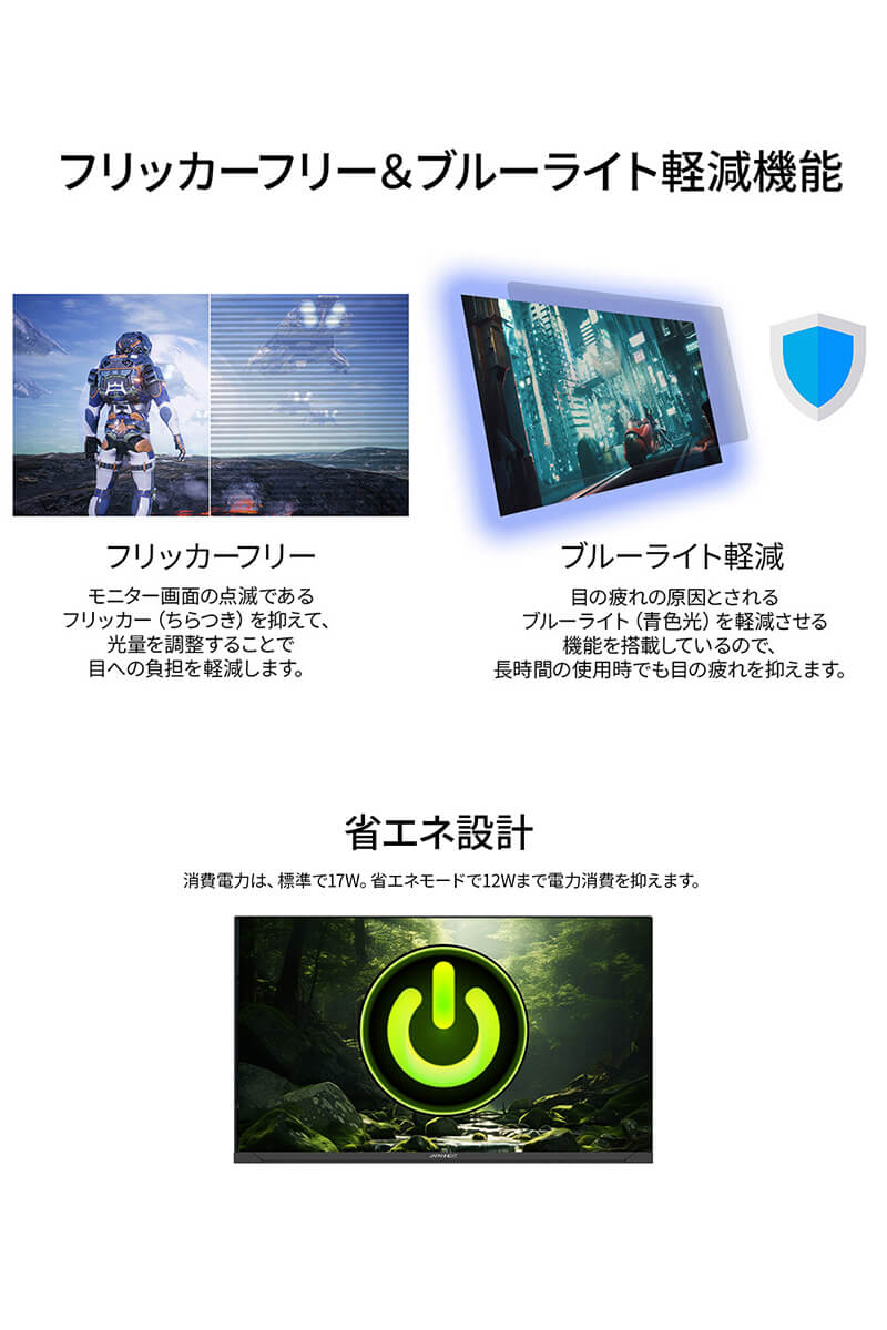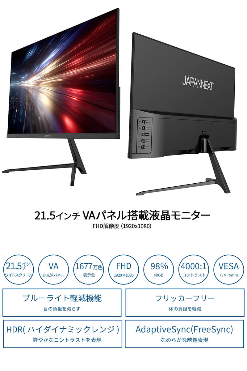 HDR(ハイダイナミックレンジ)は、明るい部分も暗い部分もくっきり表現し、リアルに迫った深みのある映像を演出します。HDR対応のブルーレイディスクやビデオ・オン・デマンド、ゲームなどの表示が可能。現実に近い美しい映像をお楽しみください。120Hzの高速リフレッシュレートと1ms(MPRT)の応答速度により、高精細で滑らかな映像表現を実現し、FPSなどの動きの速いゲームでも快適なプレイが可能です。※MPRT 1msはリフレッシュレート75Hz以上で有効。PS5とのフルHD:120Hz接続に対応。コンソールゲームでもより高精細に、かつ滑らかなゲーム表示を可能にしました。インターフェイスはHDMI 1.4×1 (120Hz)とDisplayPort 1.2×1 (120Hz)を搭載し、様々なタイプの機器との接続が可能です。AdaptiveSync(FreeSync)に対応。画面のリフレッシュレートとコンテンツのフレームレートのズレから生じるティアリングを防ぎ、滑らかで美しい映像を実現します。また、長時間使用時に眼に優しいフリッカーフリー(ちらつき軽減)、ブルーライト軽減モードを搭載します。75x75mmのVESAマウントに対応しますので、別売りのモニターアームなどに使用が可能です。スピーカーは搭載しておりません。本製品には、2年間のメーカー保証が付きます。