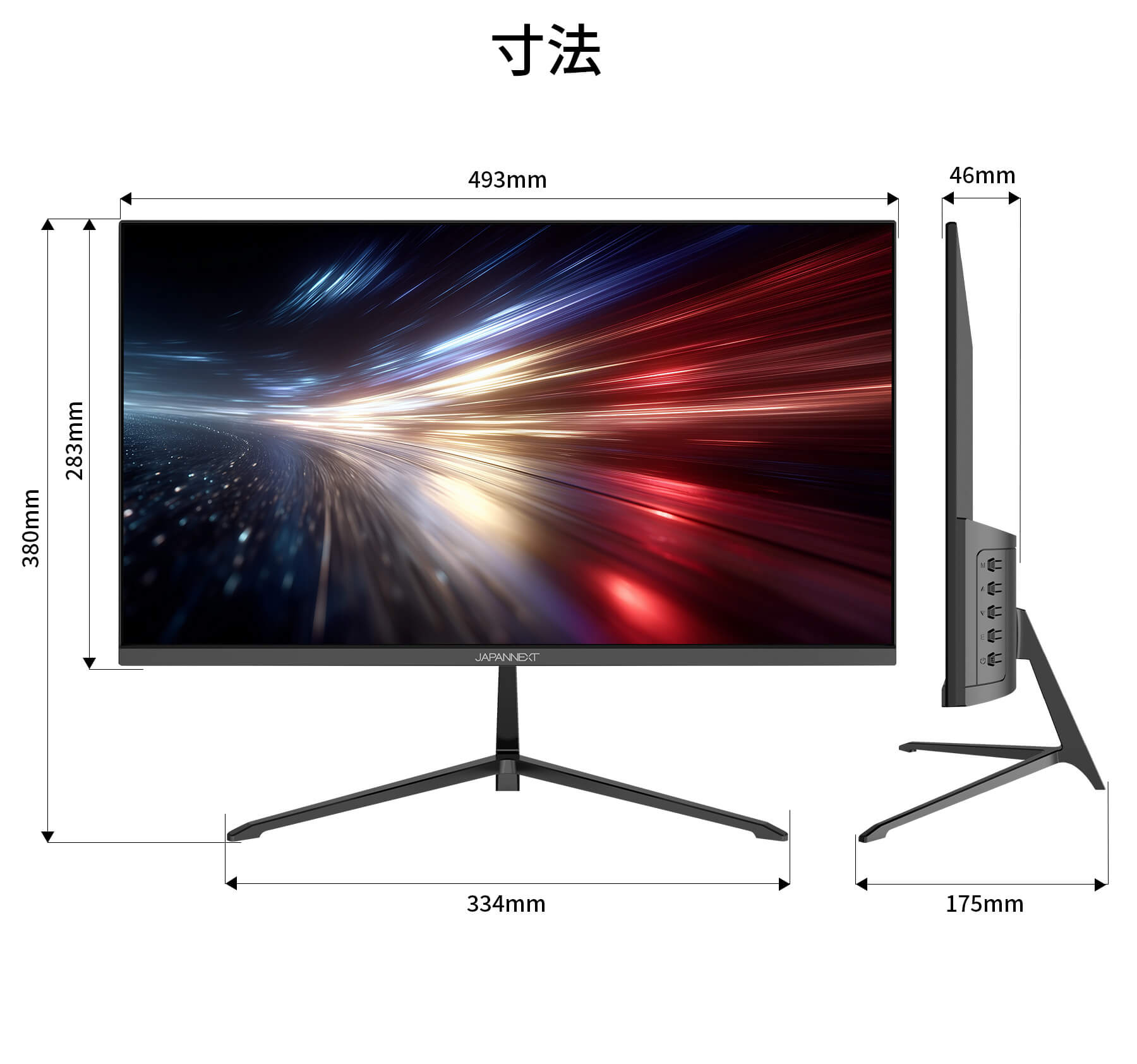 外形寸法(スタンド付):高380mmx幅493mmx奥行175mm スタンド幅334mm