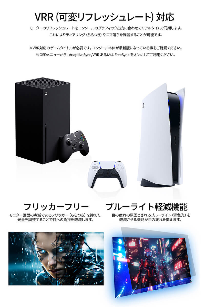 120Hzの高速リフレッシュレート、1ms(MPRT)の高速応答速度により、より滑らかな映像表示を可能にし、ゲームプレイに最適です。3つのゲームモードを搭載しFPSなどゲームに合わせて変更可能です。※MPRT1msはリフレッシュレート100Hz以上で有効。ゲーミングPCだけでなく、PS5との4K:120Hz接続に対応し、大画面で高精細なゲームを存分に楽しめます。また、可変リフレッシュレート(VRR)にも対応し、ティアリングやスタッタリングを軽減し、よりなめらかにVRR対応ゲームを表示します。最大輝度400cd/m2、sRGB:100%の広色域に対応した液晶パネルは、HDR400相当の性能を持ち、コンテンツを色鮮やかに映し出します。HDR(ハイダイナミックレンジ)は、明るい部分も暗い部分もくっきり表現し、リアルに迫った深みのある映像を演出します。HDR対応のブルーレイディスクやビデオ・オン・デマンド、ゲームなどの表示が可能。現実に近い美しい映像をお楽しみください。入力端子はHDMI 2.1 x2 (120Hz)とDisplayPort 1.4 x1 (120Hz)、さらにUSB-C x1 (120Hz/最大65W給電)を装備し、様々な機器との接続が可能です。USB-C(最大65W給電)は、対応のPCであればUSB-Cケーブル1本でモニターへの映像出力とノートPCへの給電が可能。ケーブル1本でスッキリ接続出来るだけでなく、テレワーク、出社併用の場合などノートPCのACアダプターを持ち運ぶ必要が無くなります。KVM機能に対応。モニターに接続したキーボード、マウスをデスクトップPCやUSB-C接続のノートPCで入力を切り替えた際にもそのまま使用可能です。AdaptiveSync(FreeSync)に対応。画面のリフレッシュレートとコンテンツのフレームレートのズレから生じるティアリングを防ぎ、滑らかで美しい映像を実現します。また、長時間使用時に眼に優しいフリッカーフリー(ちらつき軽減)、ブルーライト軽減モードを搭載します。75x75mmのVESAマウントに対応しているので別売のモニターアームやモニタースタンドへの取り付けが可能です。2Wx2のスピーカーを搭載しています。本製品には、2年間のメーカー保証が付きます。