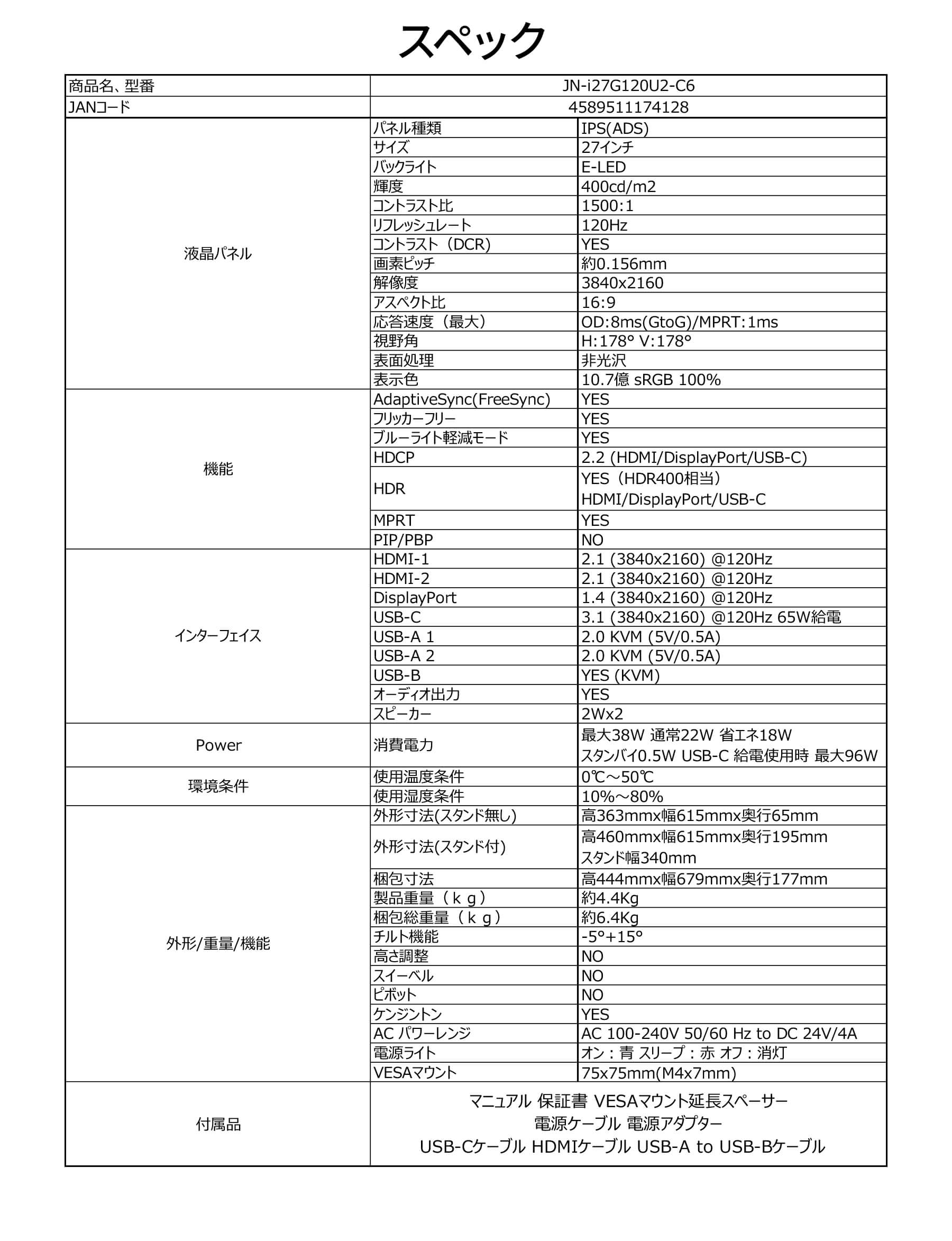 付属品:マニュアル 保証書 VESAマウント延長スペーサー 電源ケーブル 電源アダプター USB-Cケーブル HDMIケーブル USB-A to USB-Bケーブル
