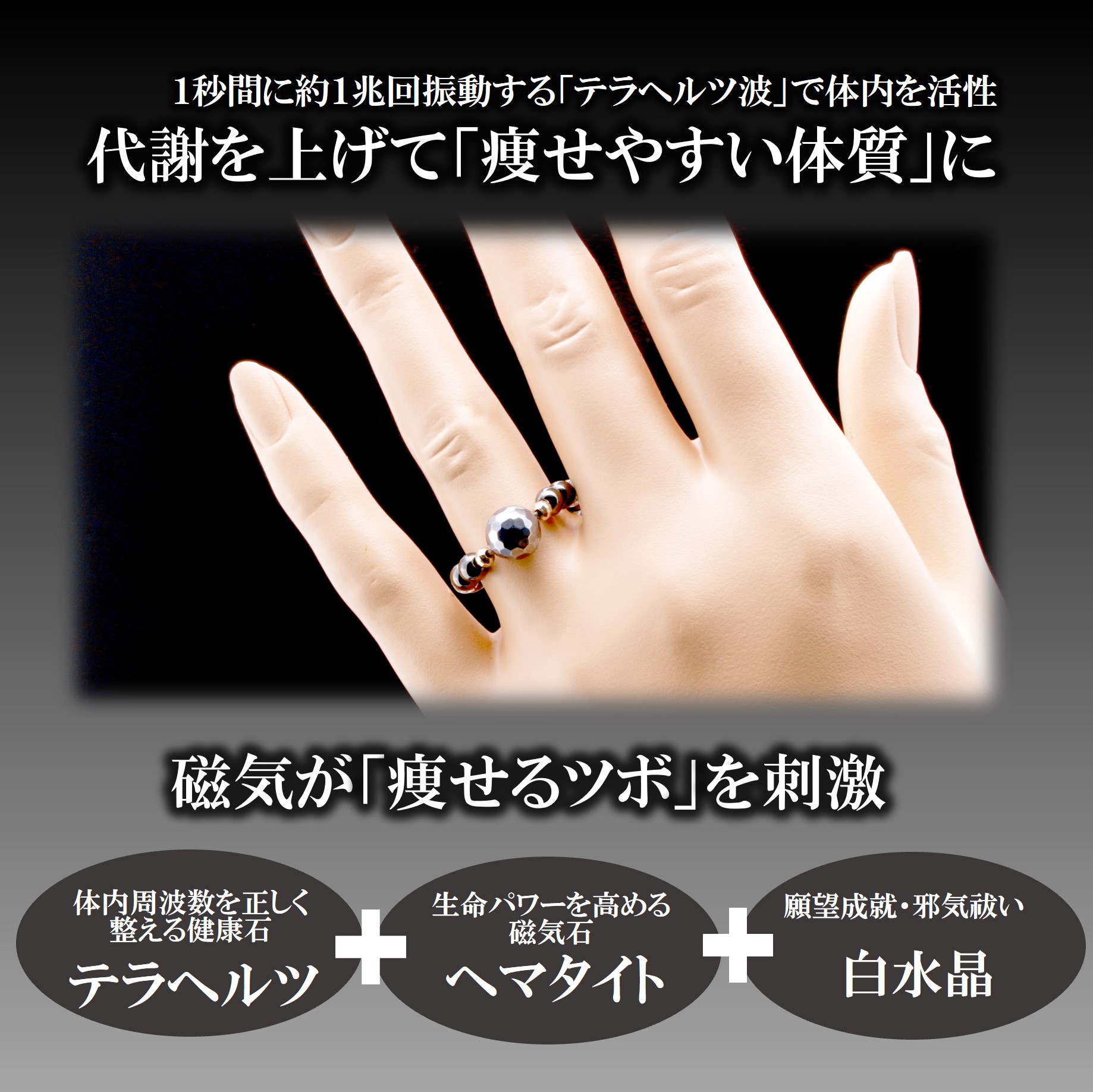 ・テラヘルツ・ヘマタイトの2つの鉱石とパワーストーン白水晶のリング。 1秒間に約1兆回振動する「テラヘルツ波」で体内を活性代謝を上げて「痩せやすい体質」に! ・テラヘルツ×ヘマタイト×白水晶 身に着けることで、願望成就、開運、厄除けに!