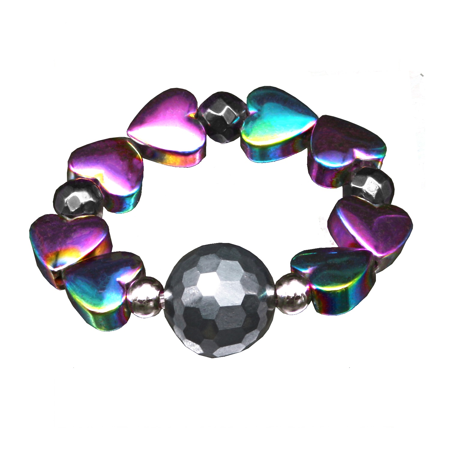 テラヘルツ:1個(8mm珠/カット)、ヘマタイト:8個(6×6mmハート型カット レインボーカラー)、3個(4mm珠/カット)、ビーズパーツ:2個(3mm) 中糸:ポリウレタンゴム