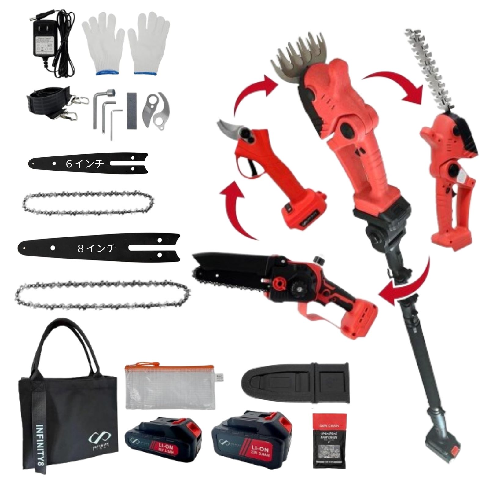 【付属品】チェーンソー・剪定バサミ・ヘッジトリマー・バリカン・延長ポール・バッテリー・充電器・収納バッグ・ベルト・手袋・ハサミ替え刃・チェーンソープレート&替えチェーン(6インチ・8インチ)・チェーンソーカバー・バッテリー2個・収納バッグ※2個口での発送となります。