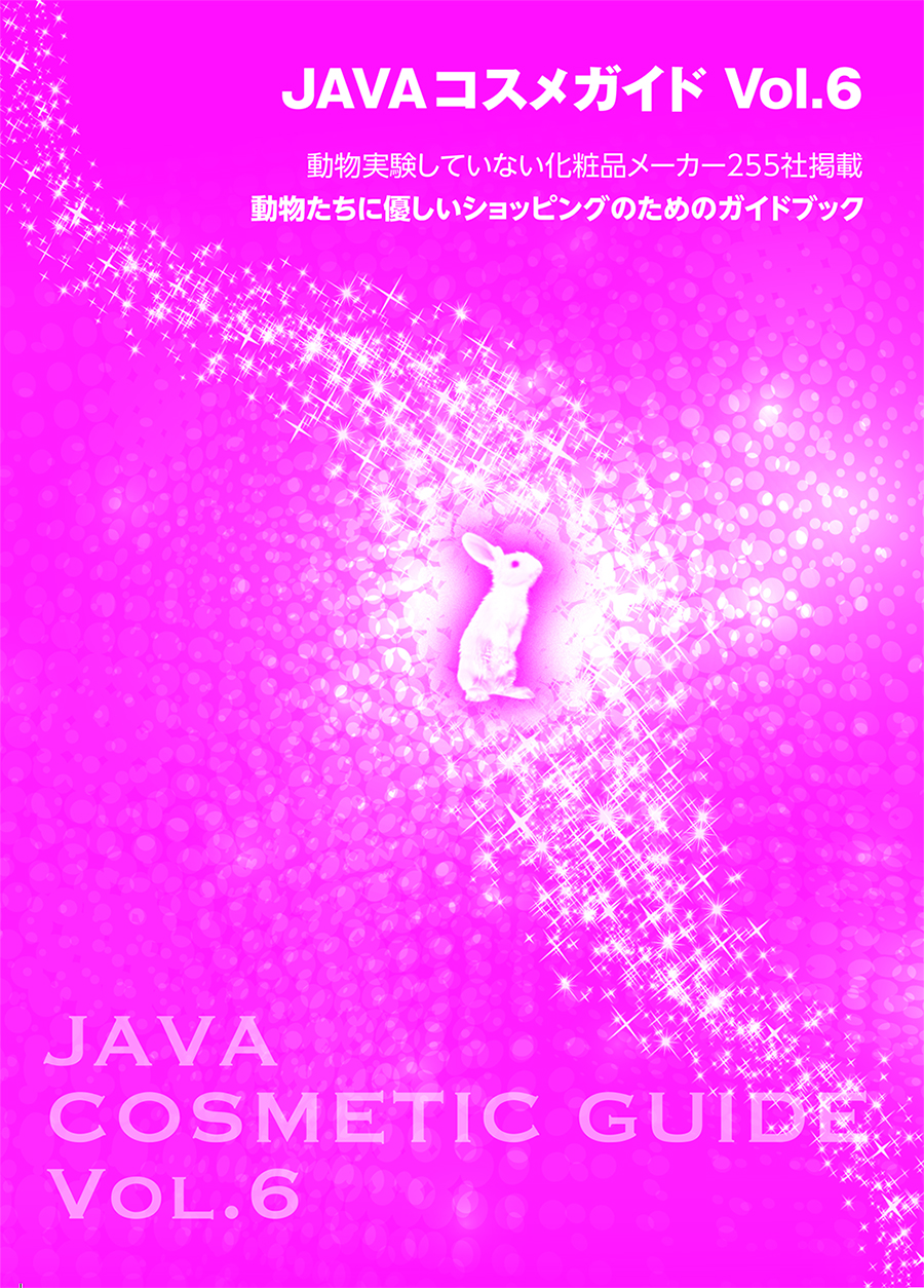JAVA独自のアンケートによって、化粧品メーカーなどを「動物実験していない」「動物実験している」に分類した『動物たちに優しい化粧品や日用品を選ぶためのガイドブック』 です。1998年にVol.1を発行、今刊でVol.6となりました。