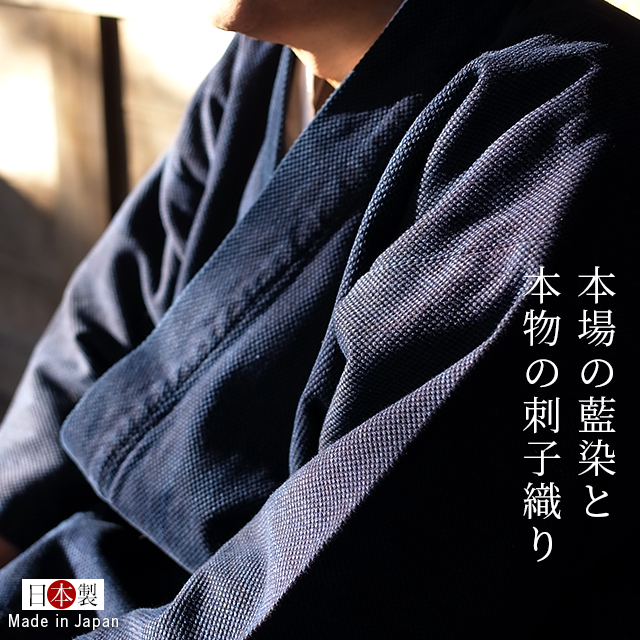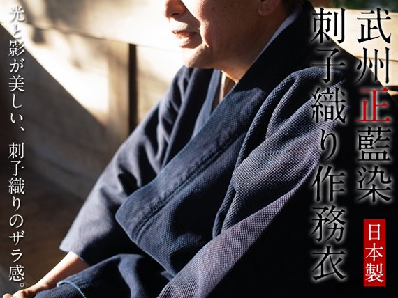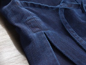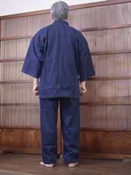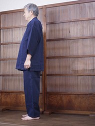 | 武州の高級剣道着の素材として知られる「正藍染刺子織り」を作務衣向けに改良し、さらにバイオウォッシュ加工により、しなやかな肌ざわりと刺子独自の重厚感のある高級作務衣です。 |