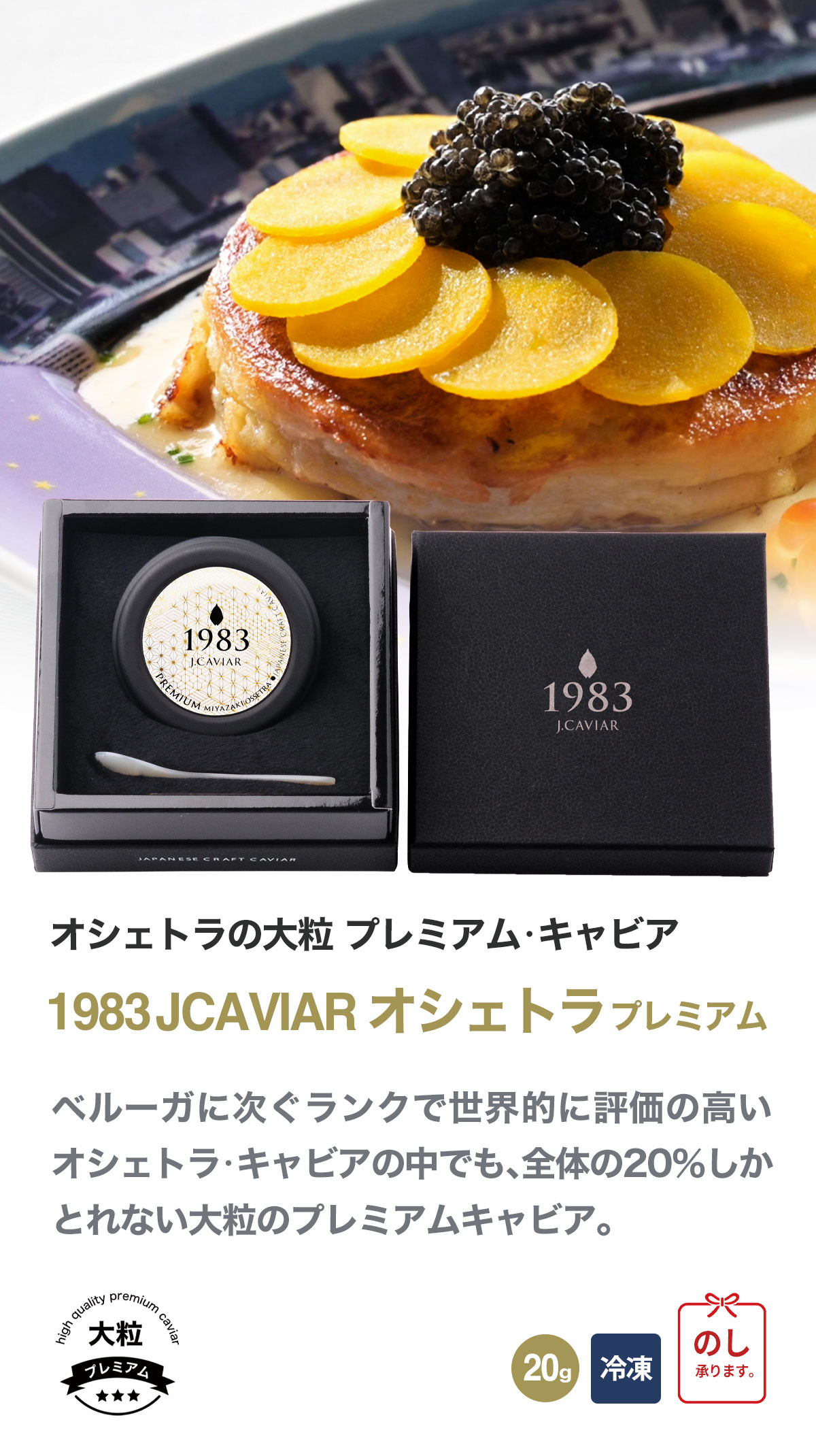 | 商品名 | 宮崎キャビア1983 オシェトラ プレミアム (20g) | 贈答用化粧箱入り |