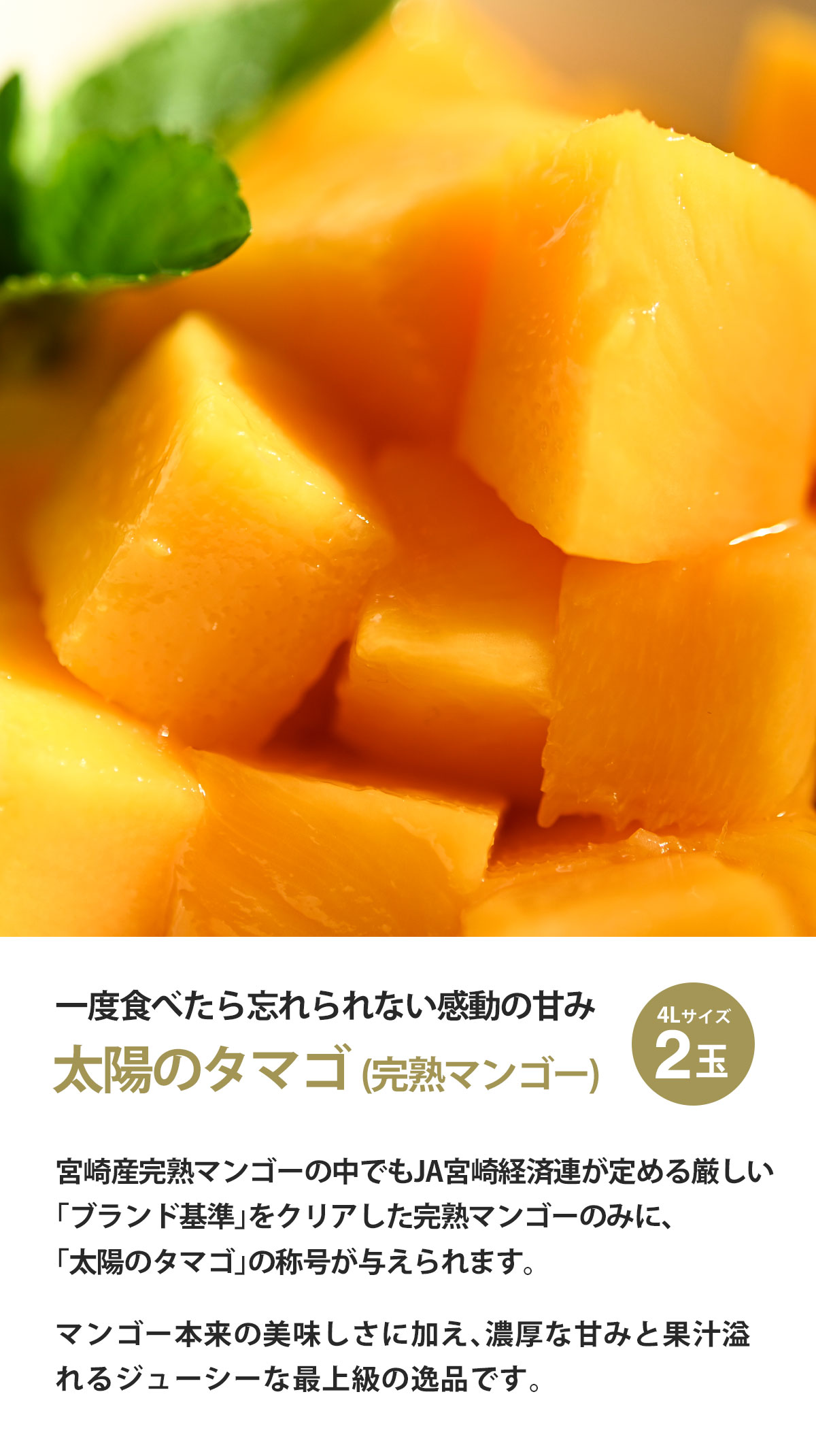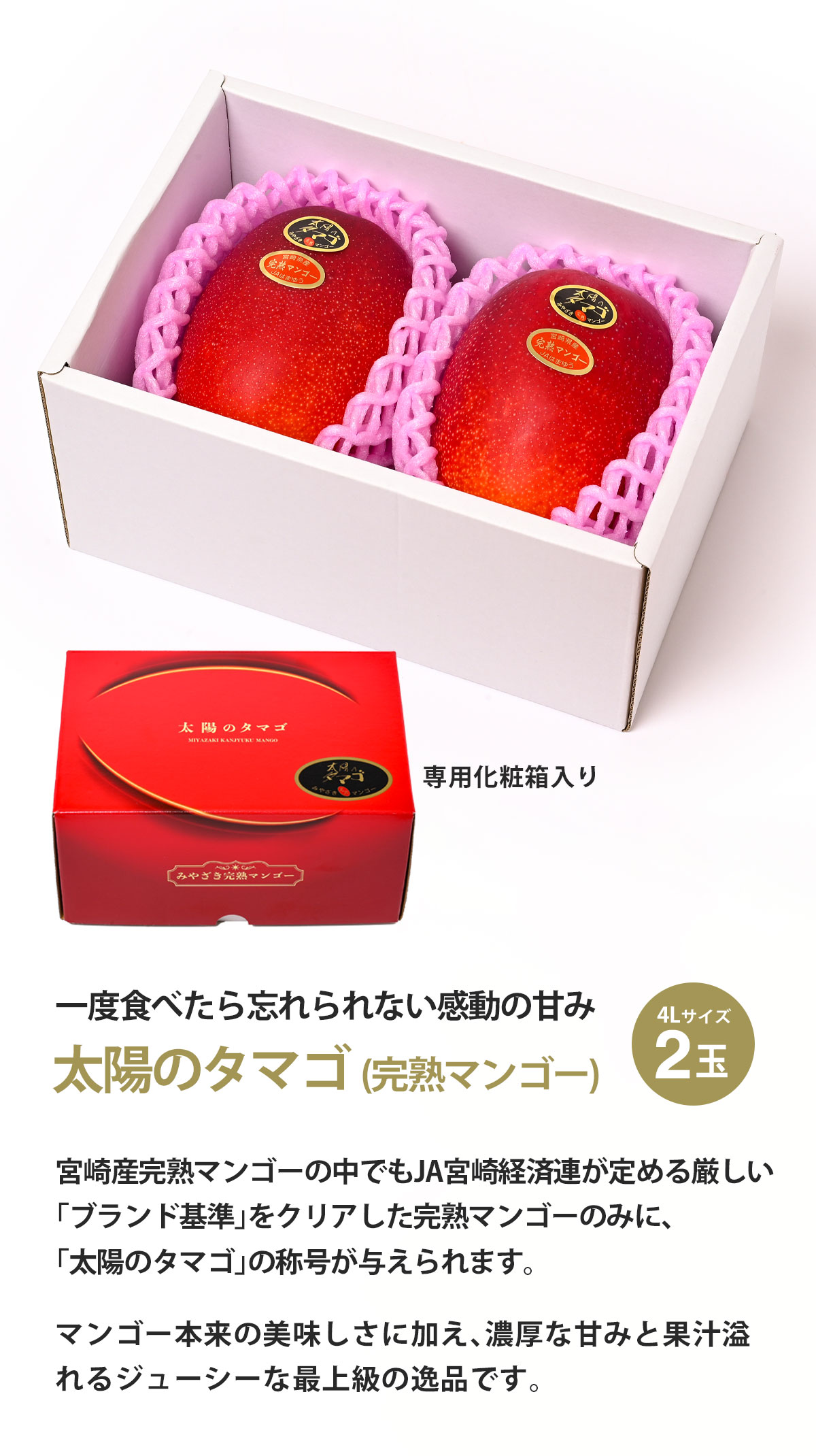 | 商品名 | 宮崎完熟マンゴー "太陽のタマゴ" 4L 2玉 |